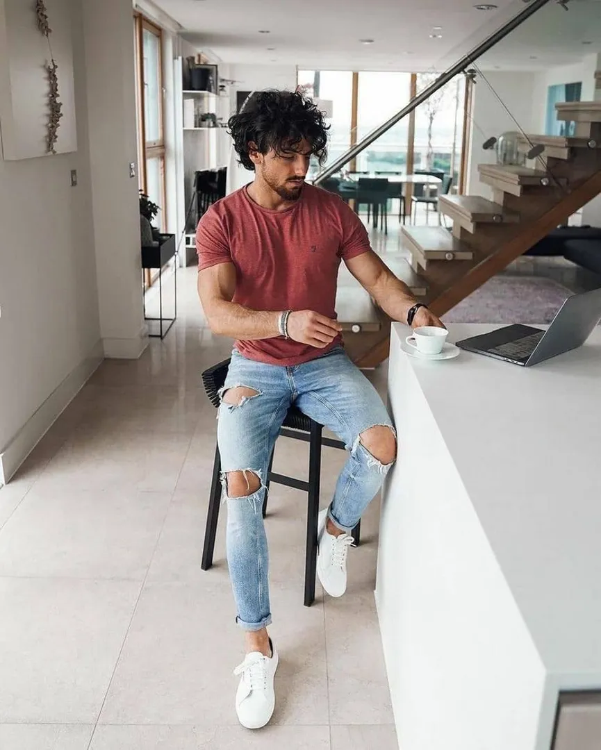 Мужские рваные джинсы на коленях обычно больше всех пользуются спросом. Необычный вид, придаваемый рваными джинсами с дырками на коленях, лучше всего подходит для мужского наряда. Парней часто встречают в рваных джинсах из-за их необузданного образа жизни.