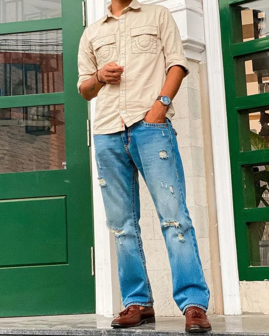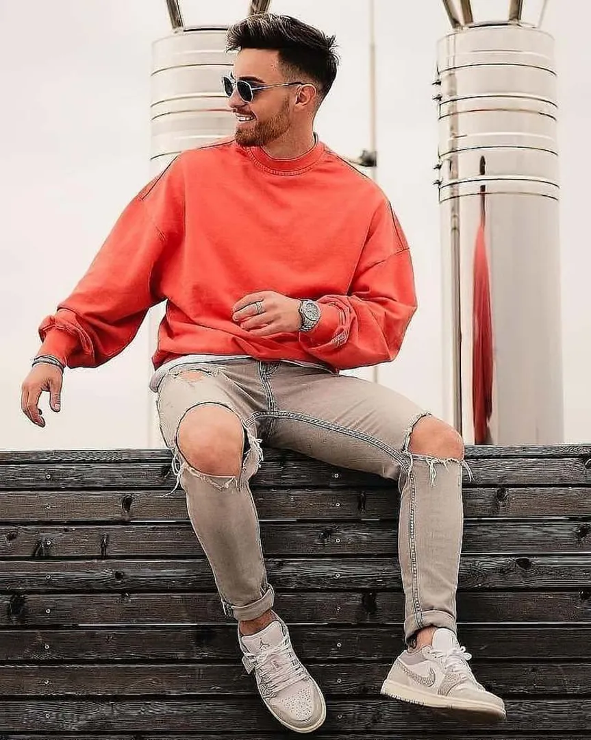 Джинсы с эффектом разрывов, особенно песочных оттенков – это тренд в мужских моделях. Они делятся на разные цвета. Мешковатая рубашка или футболка хорошо сочетается с такой парой.