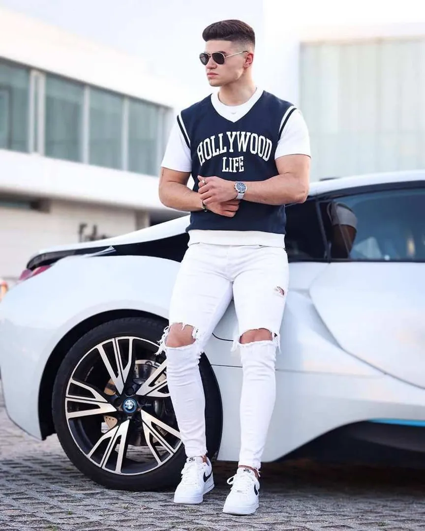 Белые джинсы – один из видов дизайнерских моделей, которые мужчины хотели бы иметь у себя в коллекции. Дизайнерские белые рваные джинсы, конечно, не менее ценные и порвать их на себе – не самое приятное занятие. Белые джинсы особенно тщательно носятся, за ними следят, чтобы не оставались пятна. Кроме того, они стоят дорого.
