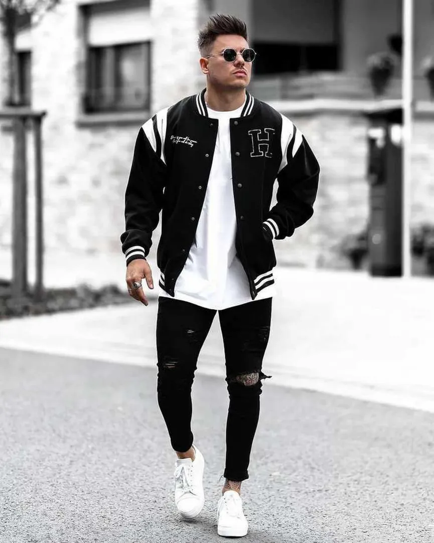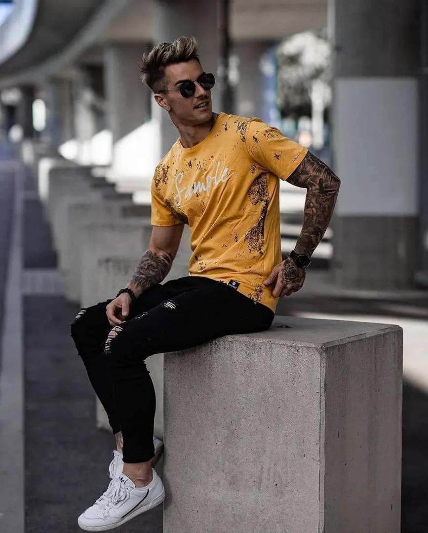 Однотонные темные или черные джинсы с небольшими разрывами выглядят круто с простыми минималистическими кожаными кроссовками и яркой футболкой, забирающей все внимание окружающих на себя.