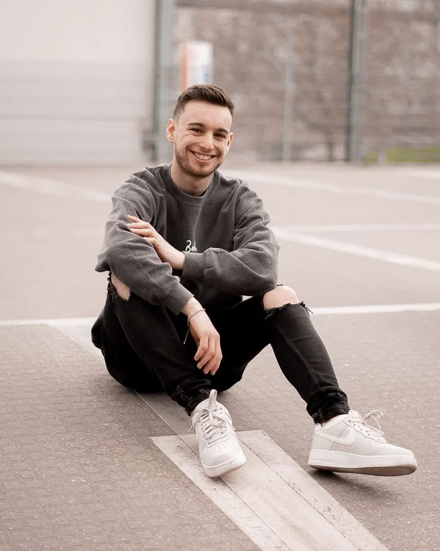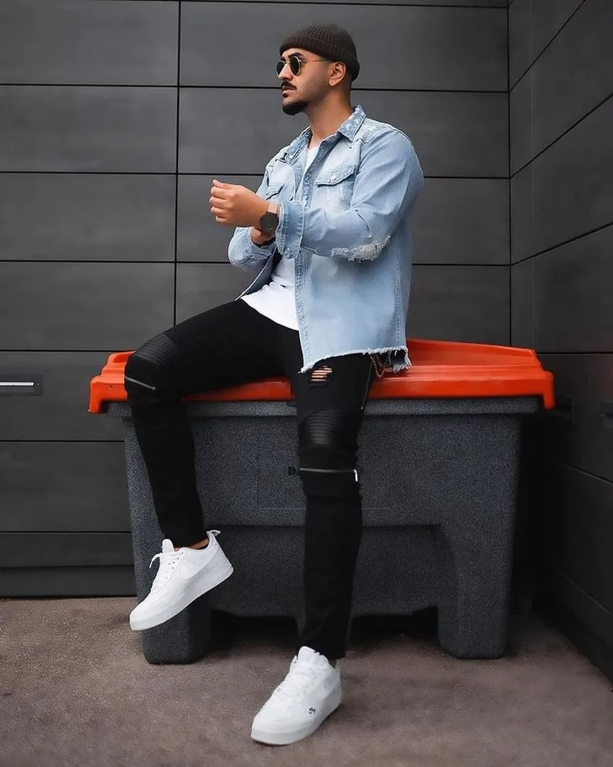 Цветная или белая рубашка в комбинации с высокими или низкими кедами прекрасно сочетаются в уличном стиле с простой разорванной парой синего цвета.