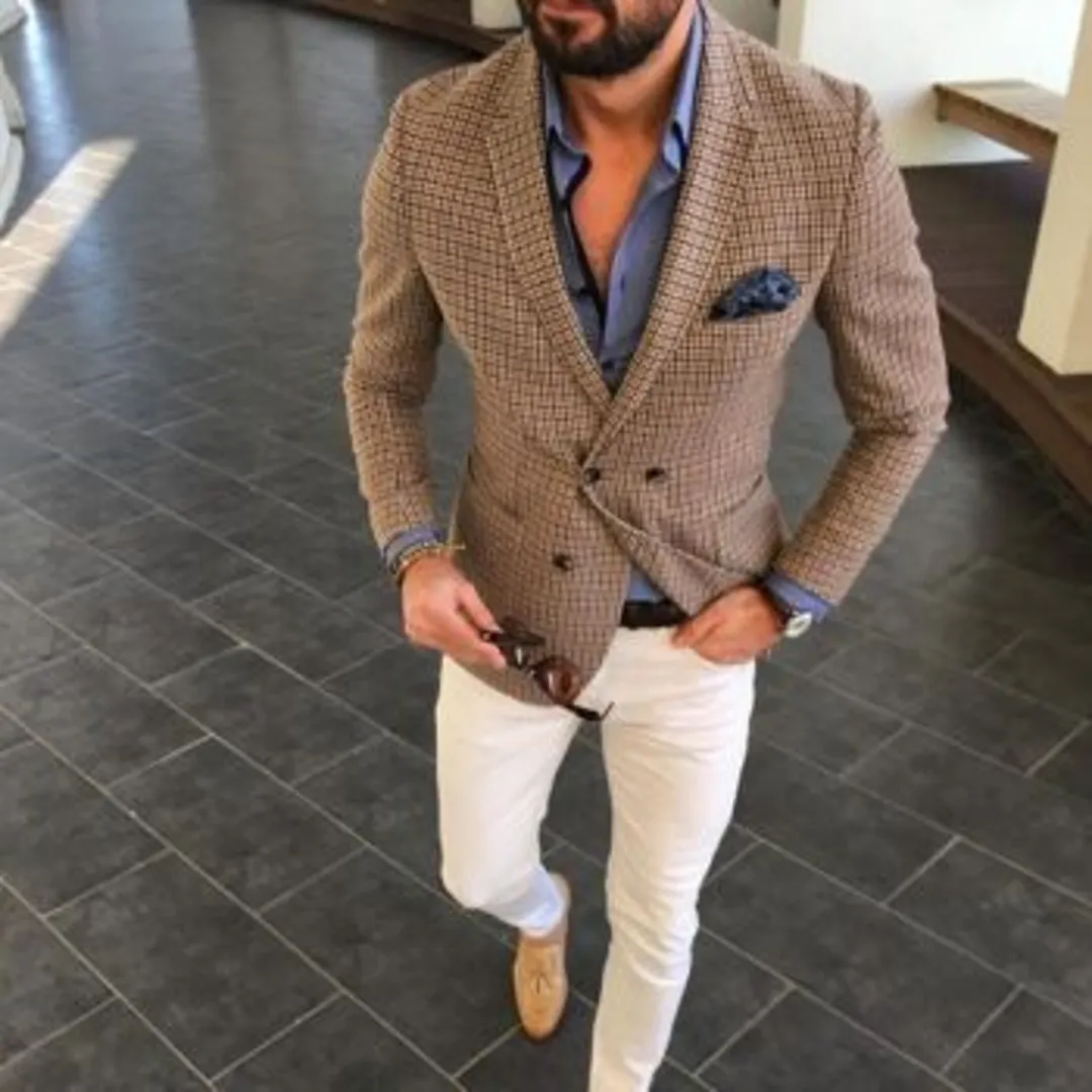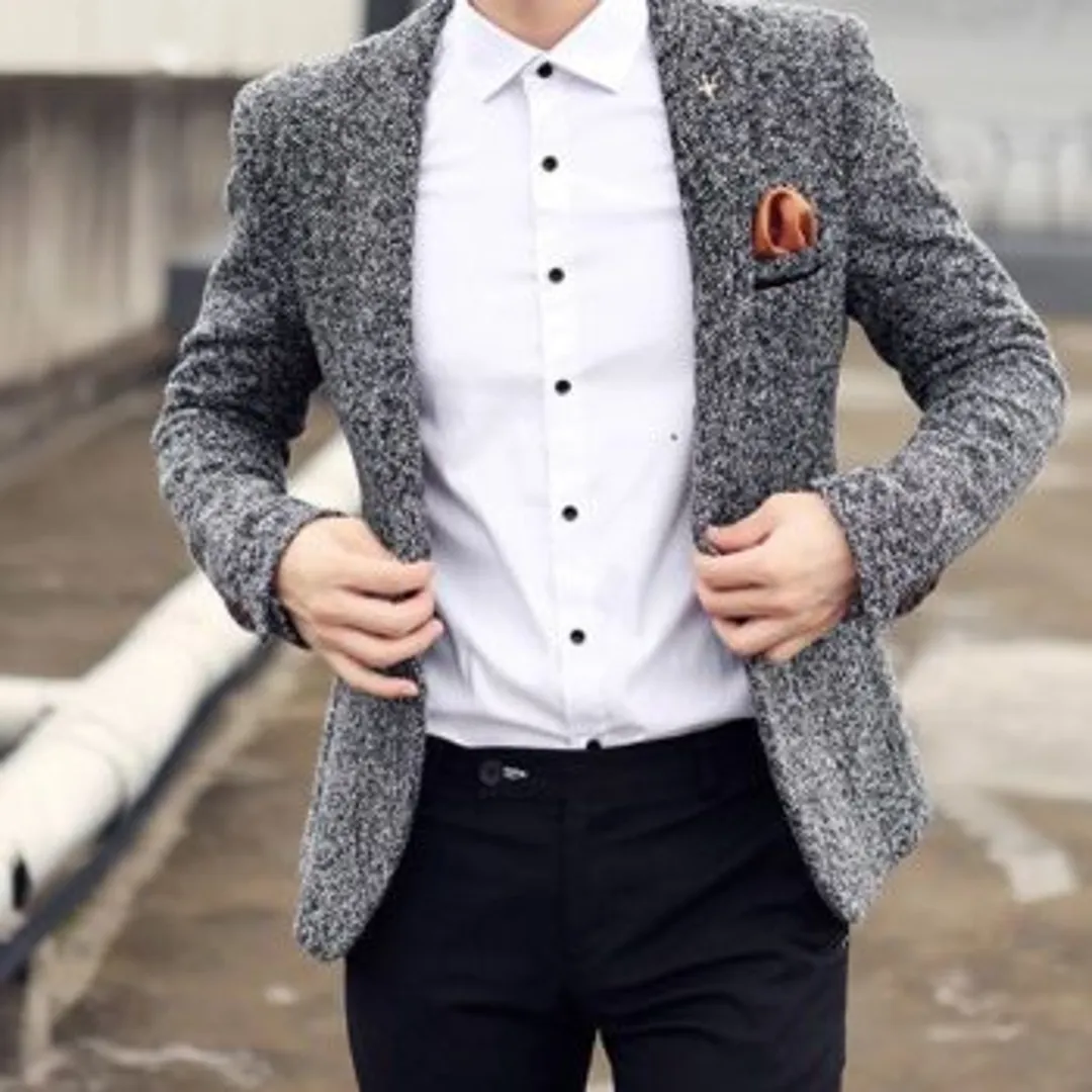 Они бывают из разных видов тканей, от хлопчатобумажных смесей до твида, до шерсти и вельвета, и каждый материал и стиль придают особый вид. Просто всегда имейте в виду характер блейзера. Если на улице настало оживленное осеннее воскресенье, и вы собираетесь пообедать, достаньте серый пиджак из твида, наденьте под него рубашку в полоску и к ним джинсы. Также, если вы собираетесь поужинать или просто пройтись на свежем воздухе, наденьте по случаю белую футболку и серые брюки чинос, сверху накиньте элегантный хлопковый темно-синий пиджак.