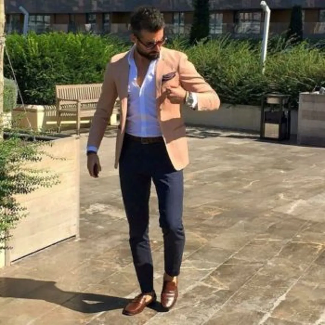 2. Подготовьтесь на полную, сочетая элегантные темно-синий блейзер с песочными хлопчатобумажными брюками чинос, синей рубашкой с воротником и коричневыми лоферами. Может быть, даже положить в синий или коричневый квадратный карман в мелкую клетку темно-синий полосатый галстук, на всякий случай, для хороших манер.