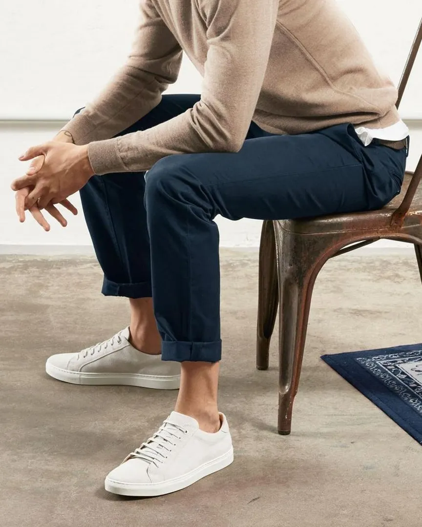 Комфорт — это ключ к успеху, поэтому единственное правило, когда дело доходит до выбора брюк чинос — это подобрать пару, которая вам понравится. Если вы хотите пойти по классическому пути, то зауженные брюки чинос-стрейч от J. Crew — это потрясающий (и доступный!) выбор. Но если вы хотите чего-то более эксклюзивного, вам подойдет Vineyard Vines. Часто можно увидеть, как мужчины носят их с подворотами, но это скорее личное предпочтение, чем правило.