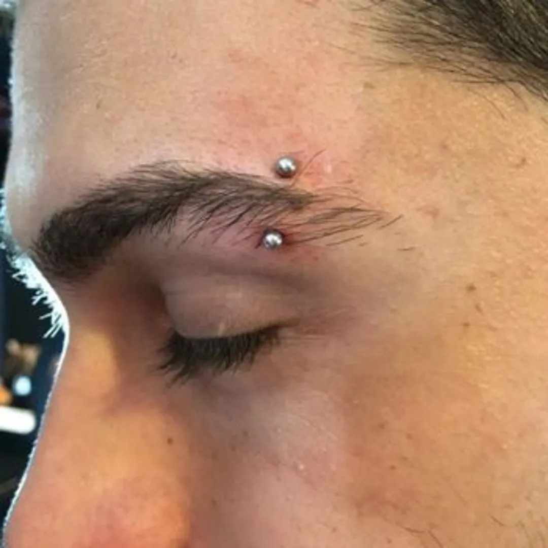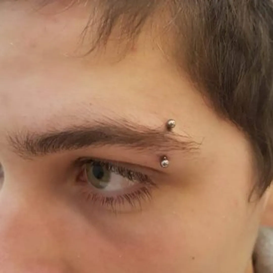 Это классический вариант прокалывания. Место под украшение выбирается на последней трети брови. Вертикальный прокол выглядит красиво, если его делают под углом 90° к брови. Вход прокола и выход располагаются на одинаковом расстоянии от оси брови. В проколе лучше не использовать кольцо, так как при неудачном проколе оно выпирает. При правильном проколе кольцо лежит на брови.