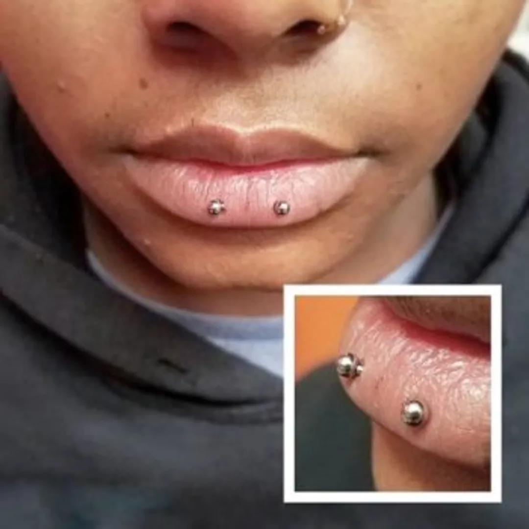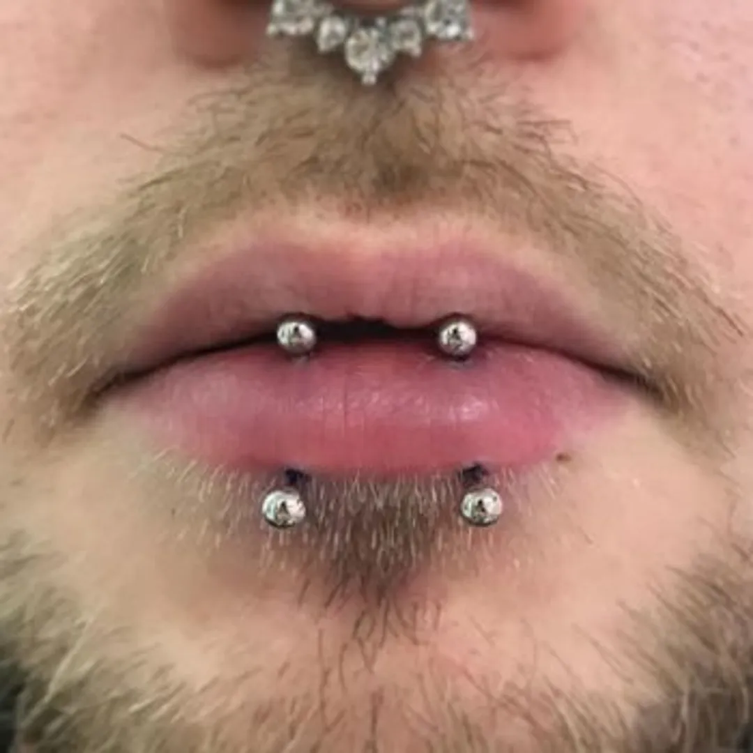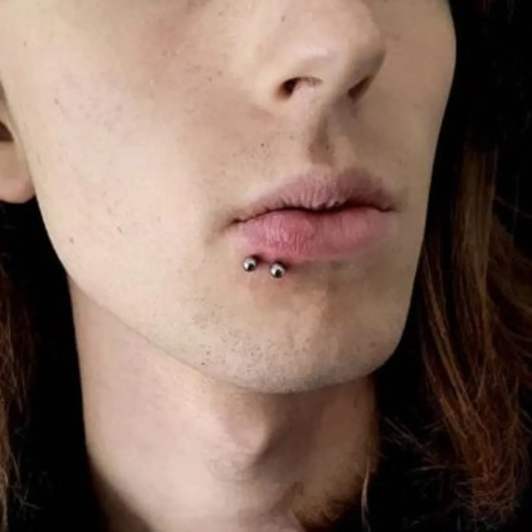 - лабрет – прокол ниже уровня зубов через нижнюю губу, такой пирсинг, в свою очередь, бывает вертикальным и горизонтальным.