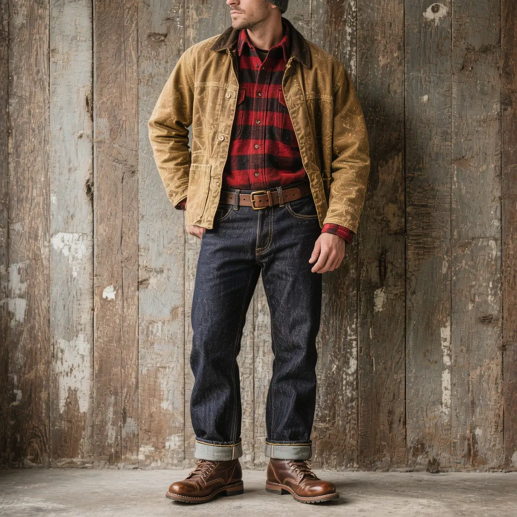 - Материалы: Плотный японский или американский деним, утиный холст, тяжёлая фланель, полноценная кожа.