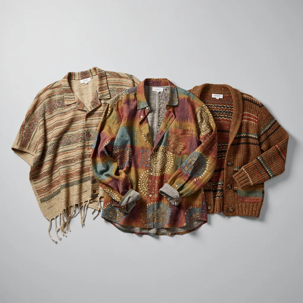 - Пончо/Кимоно/Накидка (Poncho/Kimono/Cape): Свободная верхняя одежда, часто с этническим принтом или вышивкой. Быстро создаёт характерный силуэт.
