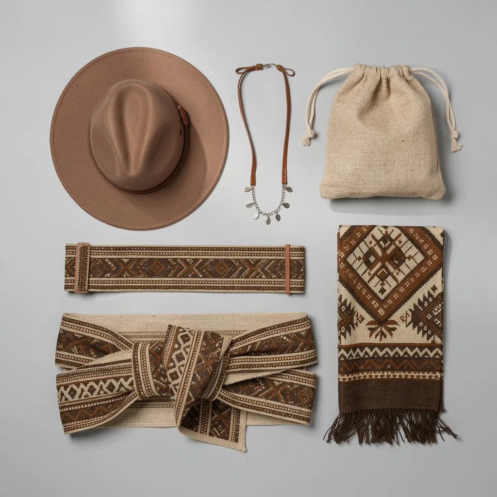 - Головные уборы: Вязаные бини с этническим узором, повязки на голову (headbands), широкополые фетровые шляпы, тюрбаны.