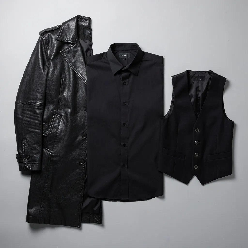 - Кожаное пальто/плащ (Long Leather Coat/Trench Coat): Длинное, до щиколоток, драматичное пальто в стиле «макси» — один из самых узнаваемых элементов. Создаёт силуэт загадочного незнакомца.