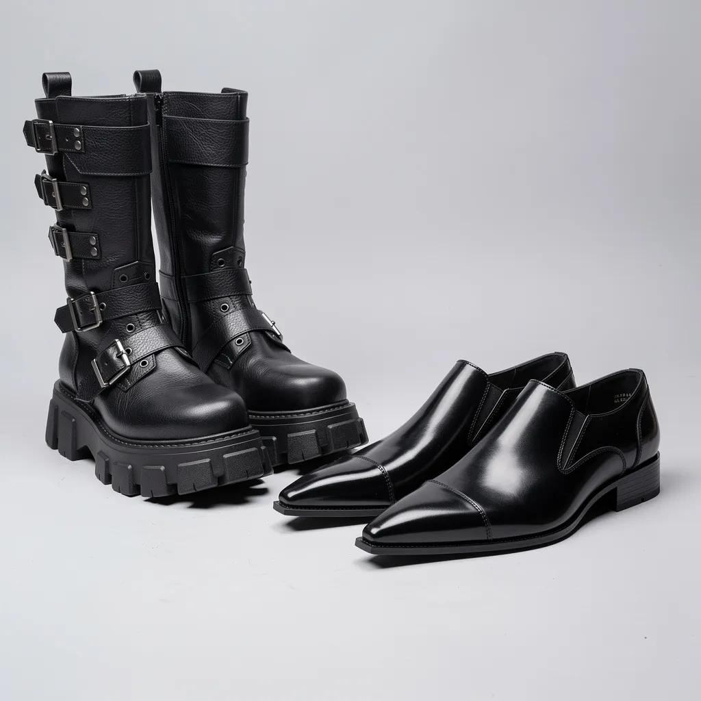 - Высокие армейские/индустриальные ботинки (Boots, например, Dr. Martens, New Rock): Часто на массивной платформе, украшенные цепями, ремнями, металлическими вставками. Символизируют устойчивость и связь с индастриал-сценой.