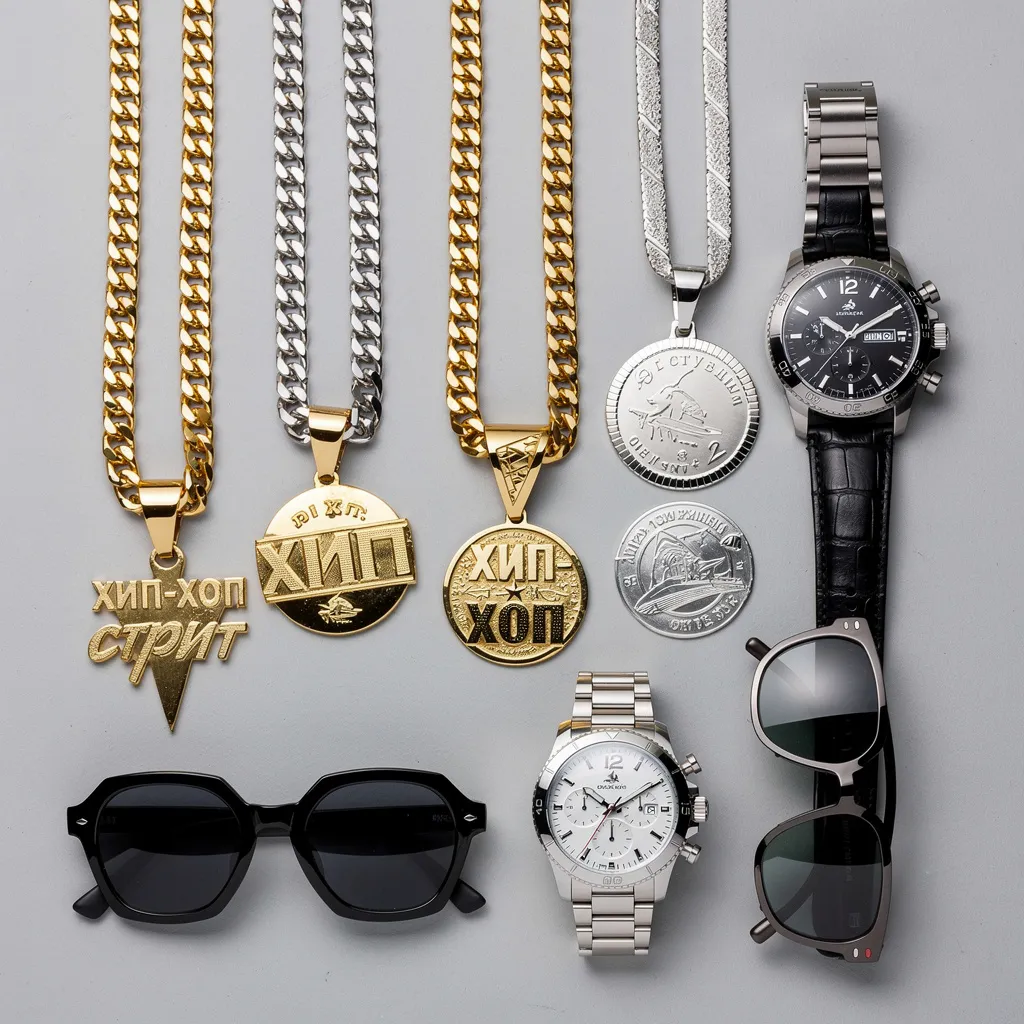 - Цепи и кулоны: Массивные, золотые или с платиной, часто с персональной символикой (крест, роза, зуб).