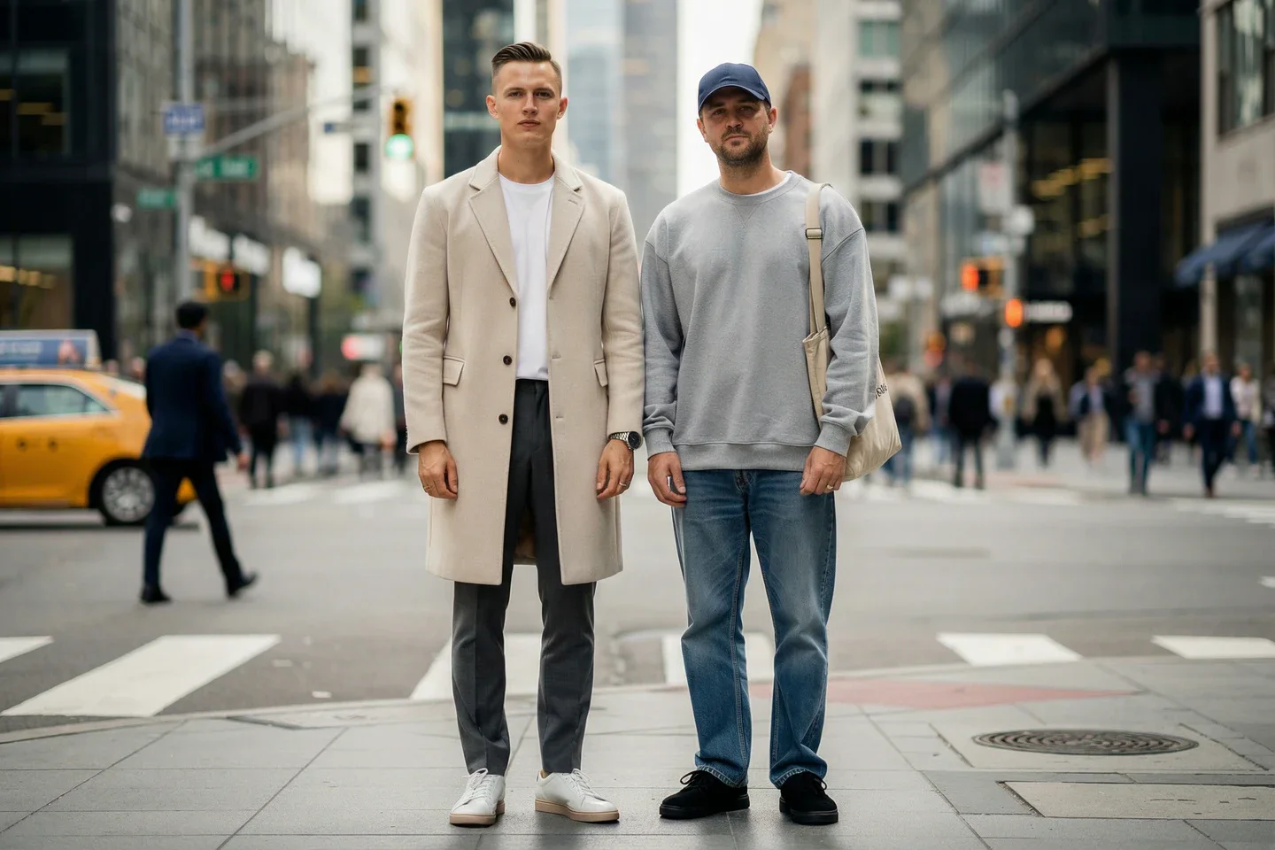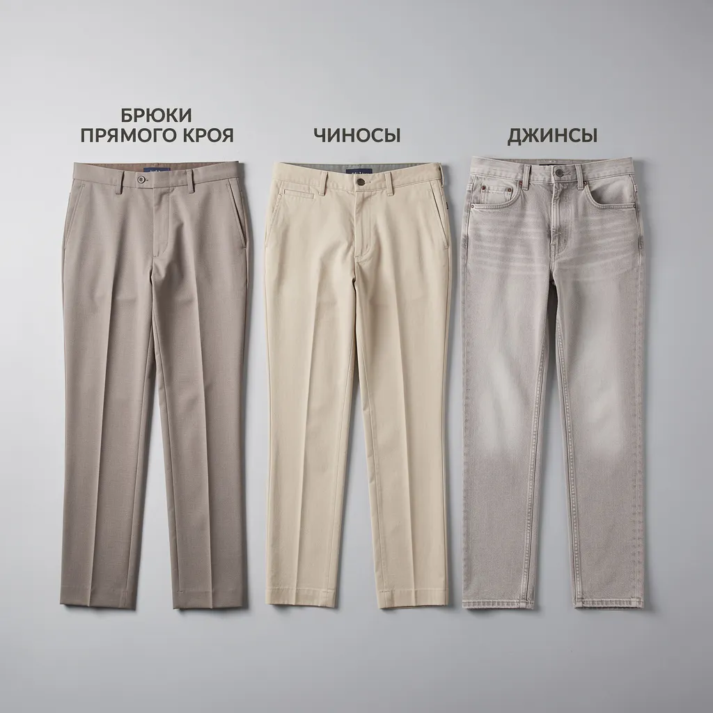 - Чиносы / Джинсы нейтрального цвета: Прямого кроя, без лишних деталей. Джинсы — чаще чёрные или тёмно-серые, без потертостей.