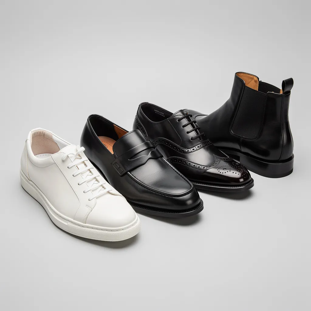 - Кожаные лоферы или броги: В монохромном исполнении (чёрные, коричневые).