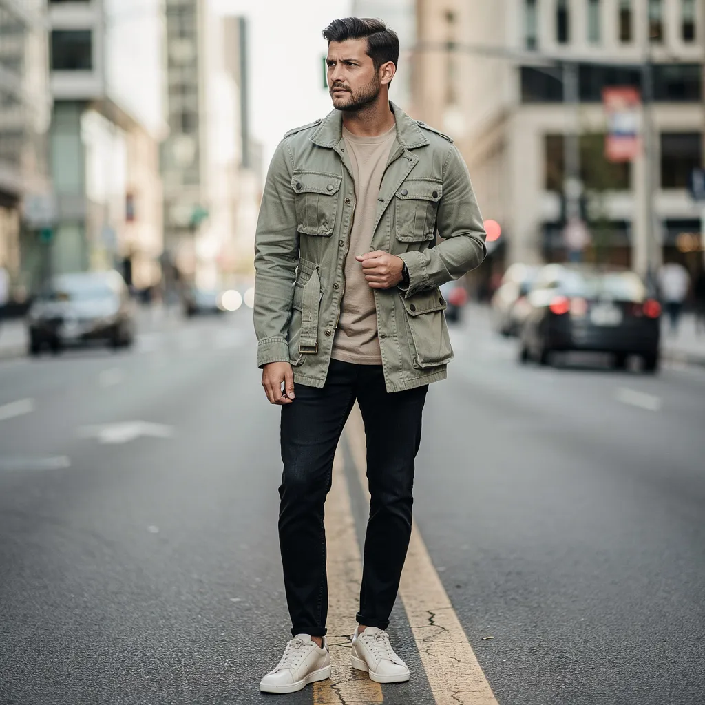 - Одна вещь — сильное заявление. Идеальная сафари-куртка или рубашка, надетые поверх простой белой футболки и чиносов, создадут законченный, стильный образ для города или загородной поездки.