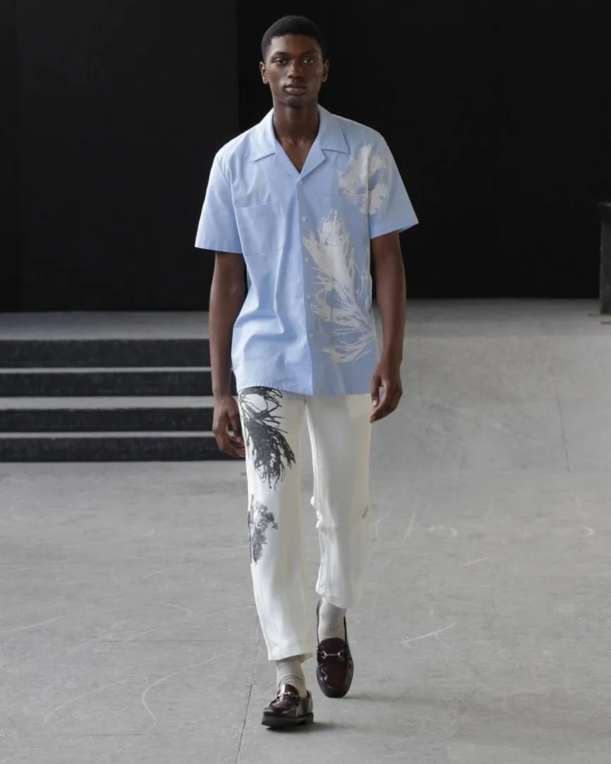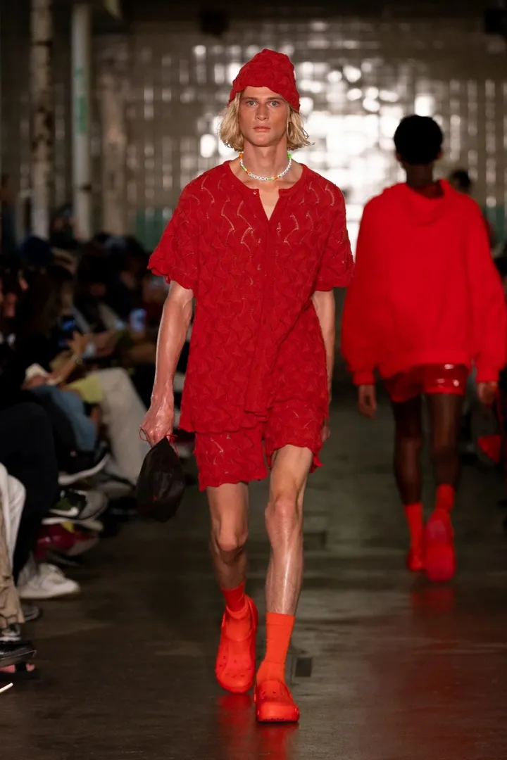 Материалы первоклассные, но не претенциозные, а китчевые рейв-принты, взятые из серии футболок, которые его мать купила во время поездки на Балеарские острова в 1980-х годах, забавны без ностальгии и не вызывают аргументации «было лучше, когда было хуже», что вполне справедливо. Кроксы на его ногах, совершенно неапологетичные, – это просто глазурь на торте того образа мышления о моде, который является прямым, весёлым и далеким от чрезмерного повествования, которое, вероятно, действительно необходимо нам всем сегодня.