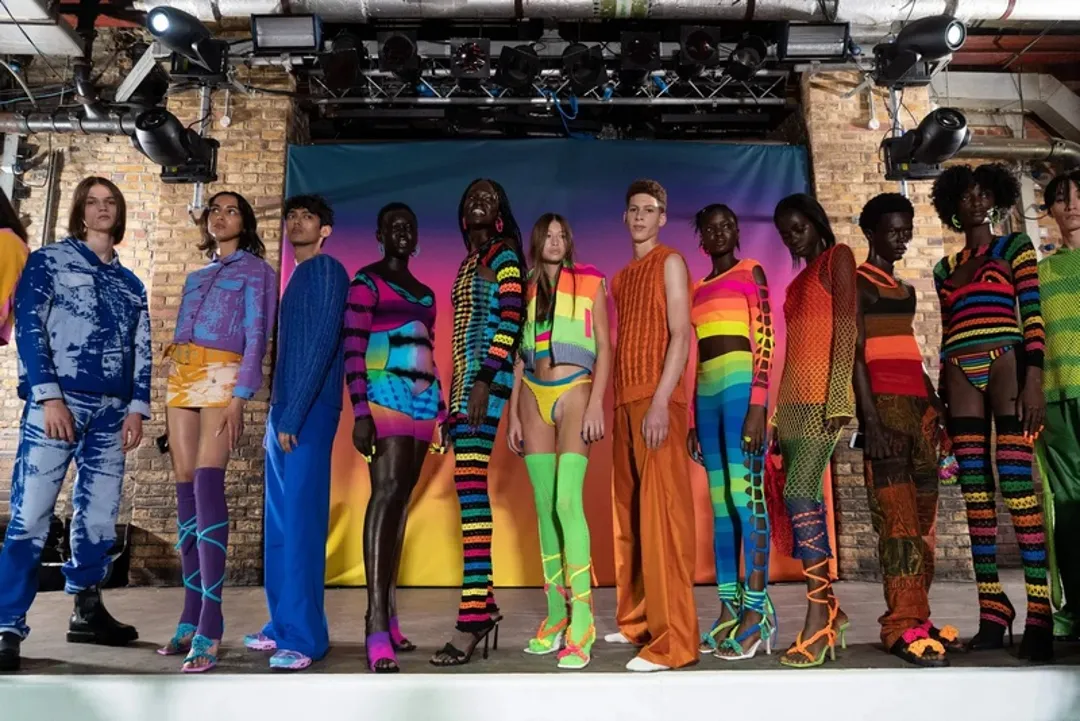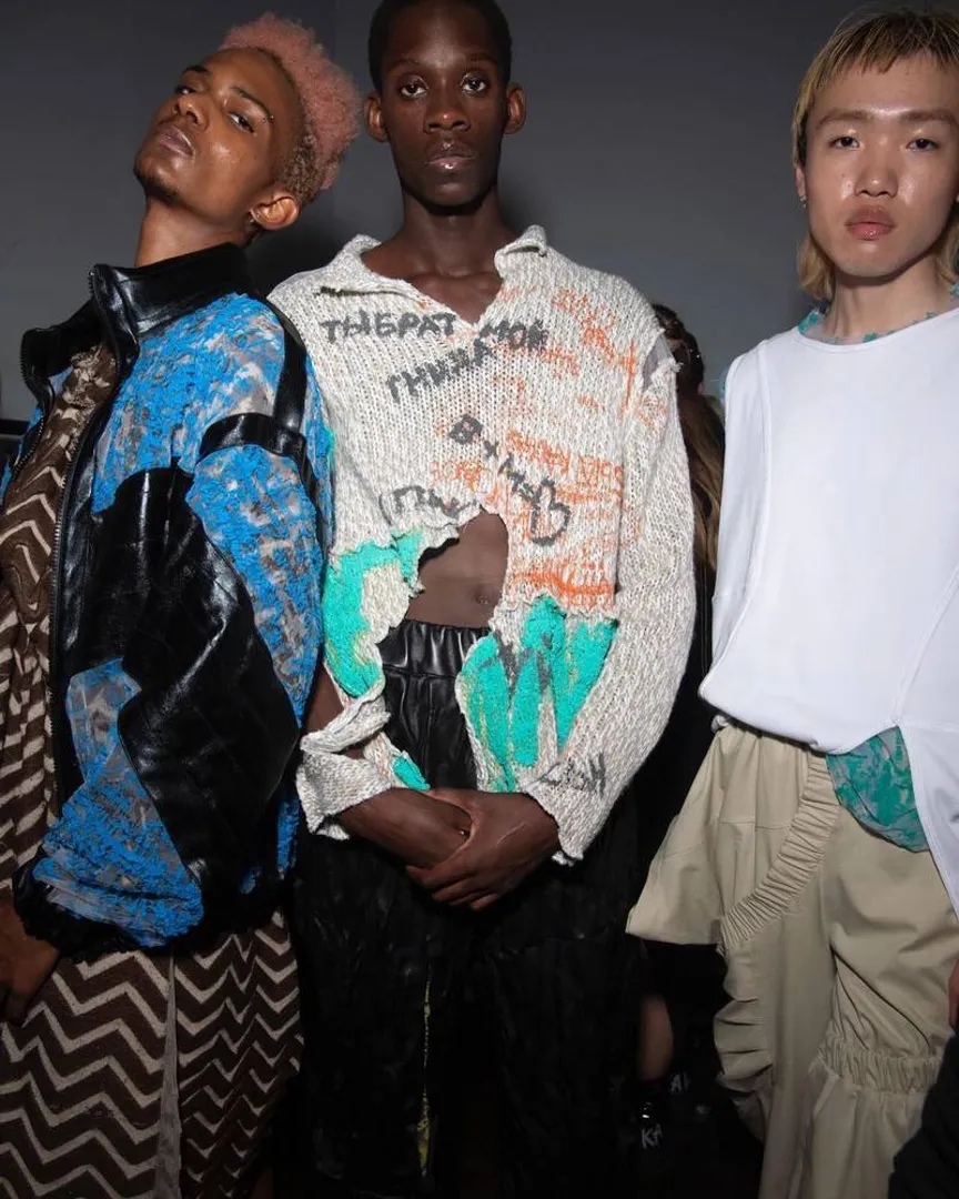 Далее, шоу выпускников университета Ravensbourne – это некое хореографическое представление, в котором студенты не стали считаться ни с чем, кроме собственного творческого пути, и нам следует взять на заметку их идеи, поскольку они будут вдохновлять дизайнеров поколения Z в ближайшем будущем, на фоне чувственности, множества сознательно обнаженных тел, скульптурной и металлической, немного киборгоподобной одежды, желания вечеринок, сакраментальных рейвов и искреннего юмора.