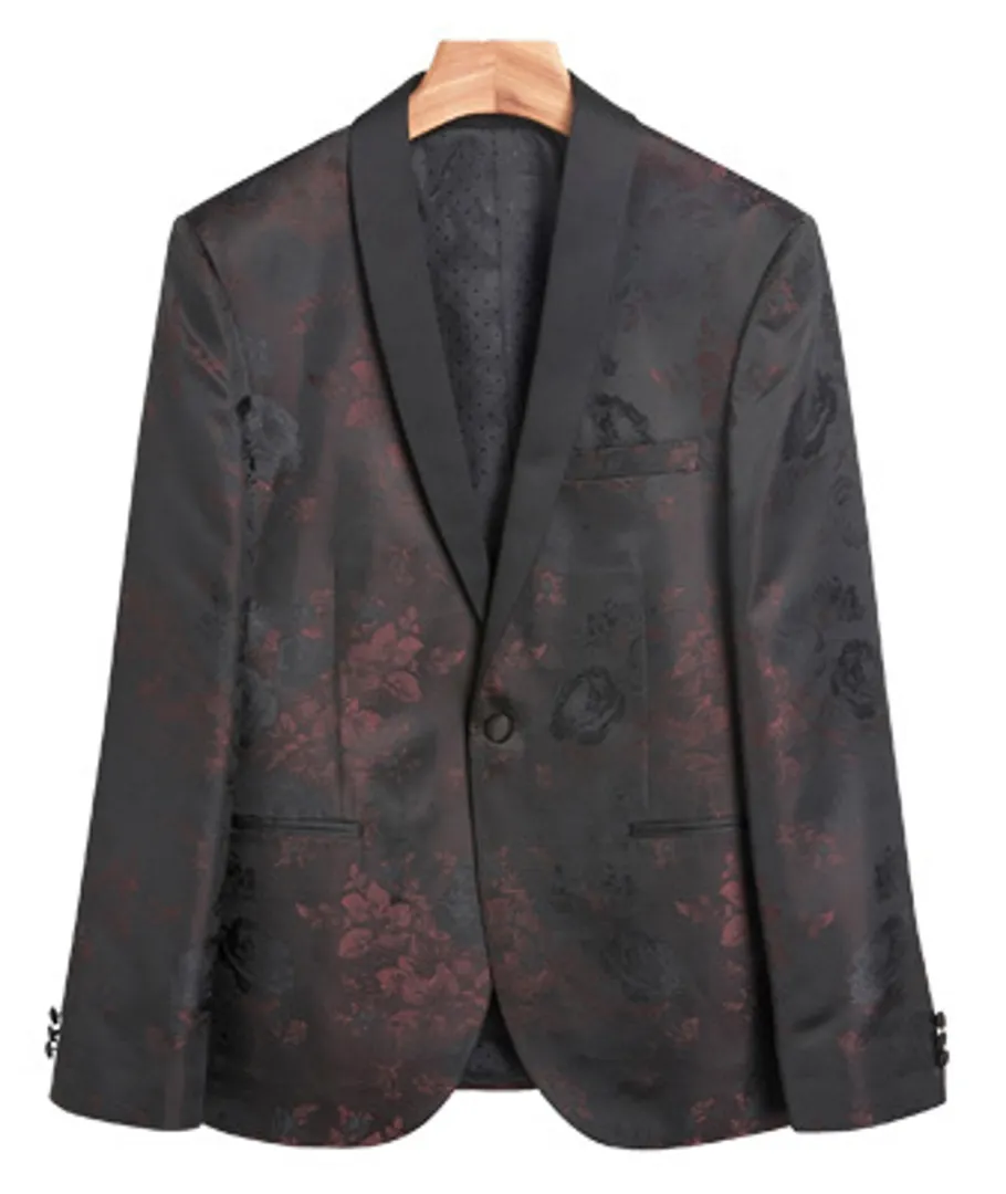 Единственное, что наводит на мысль о формальности костюма с принтом, это его базовый цвет – черный. В противном случае смелая вышивка с брызгами краски – в высококонтрастном белом – будет характеризовать костюм как тип, определенно не работающий в тех условиях, в которых исторически носился крой.