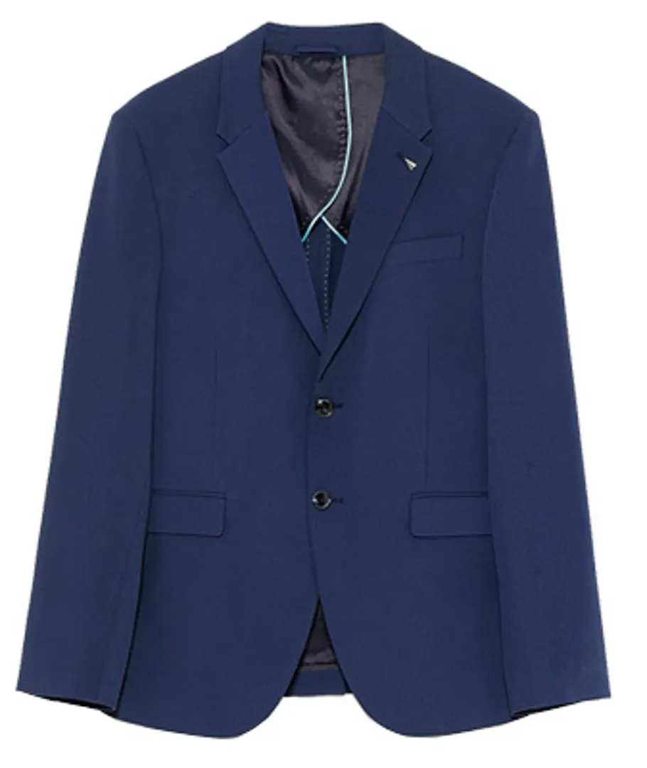 Синий костюм не является чем-то необычным, его часто можно встретить в самом заурядном среднестатистическом офисе. Его отличает одно – с чем его носят. На первый взгляд, ношение костюма поверх трикотажа с v-образным вырезом в стиле оп-арт вообще не должен работать – на самом деле сочетание можно даже расценить, как занудство, особенно потому, что здесь нет никакой цветовой координации. Но тем не менее решение значительно понижает формальность пошива. Кстати, аксессуар в виде кулона, также работает в этом направлении.