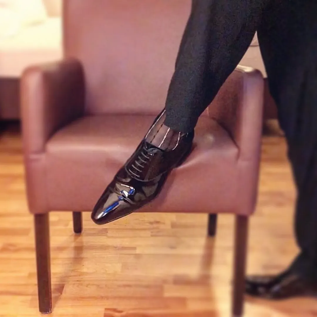Обувь должна быть лакированными оксфордами. Для единичного случая можно обойтись обычными оксфордами, если придать им зеркальный блеск на носке и пятке. Но не должно быть абсолютно никакого брогирования.