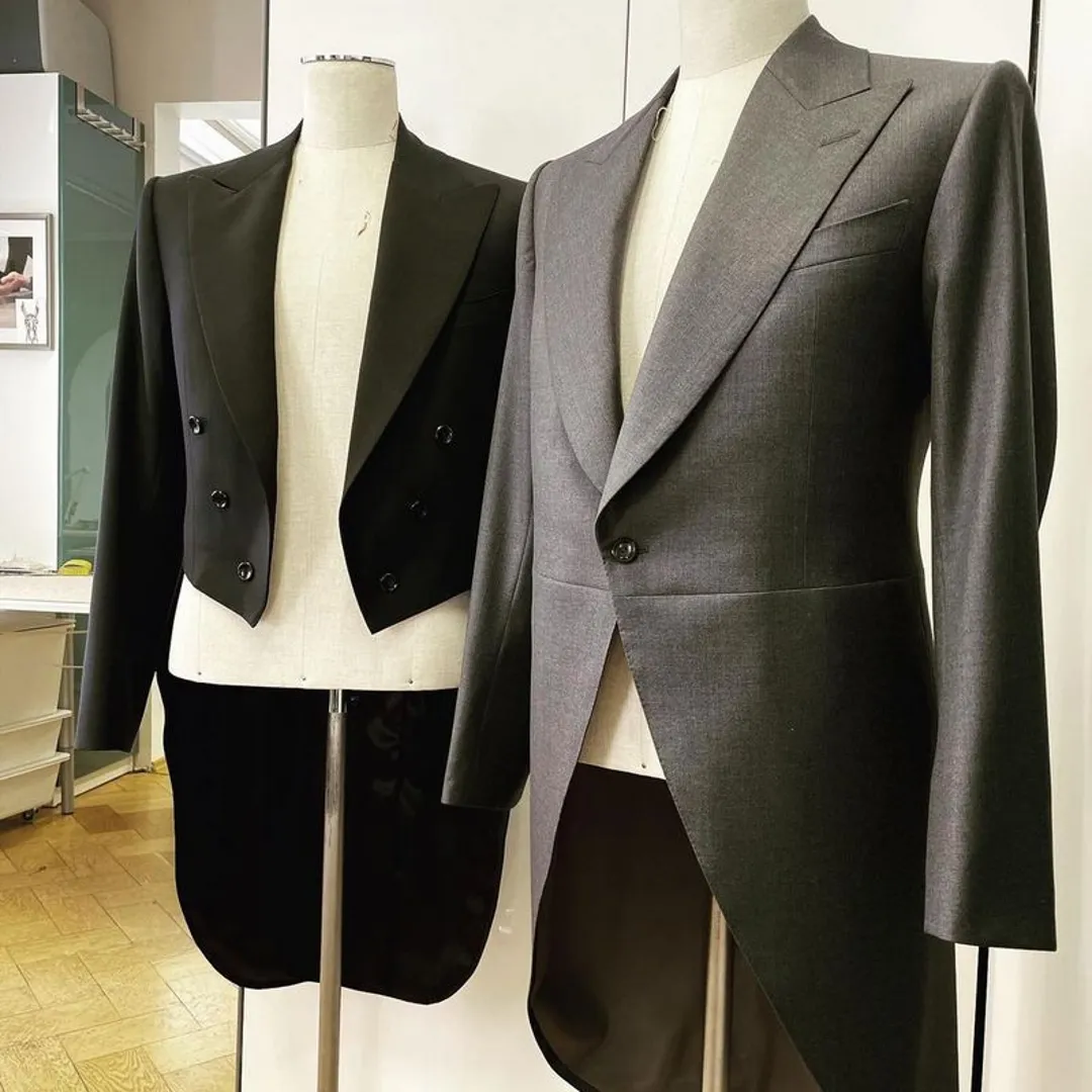 Существование пиджаков начинается с времен Регентства, когда они зачастую были высокого покроя, двубортными и носились застегнутыми. Отрезная передняя часть предназначалась для верховой езды. Все пальто с дугообразным хвостом изначально были куртками для верховой езды. Две пуговицы сзади были нужны, когда всадник слезал с лошади – он оттягивал переднюю часть пальто назад и завязывал ее на них. Вот откуда эта форма.