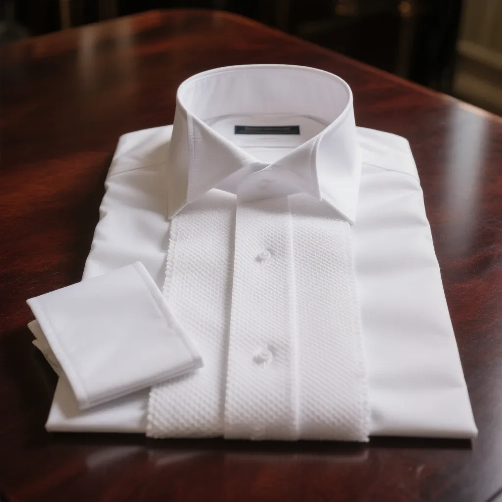 - Детали: Имеет стоячий отложной воротничок («крылышки» — wing collar). Накрахмаленная манишка (placket) — традиционный, но не всегда обязательный в современной трактовке элемент. Рукава заканчиваются одинарными манжетами, которые застёгиваются на запонки (обычно перламутровые или золотые).