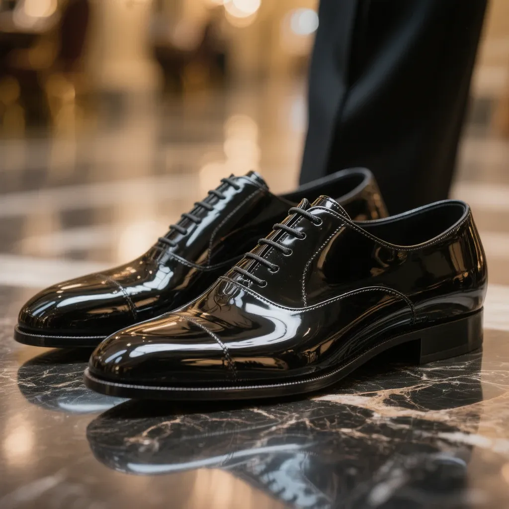 - Альтернатива: Чёрные оперные туфли (opera pumps) из лакированной кожи с атласным бантом.