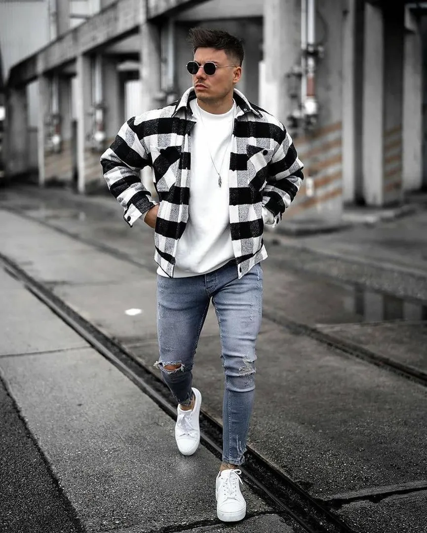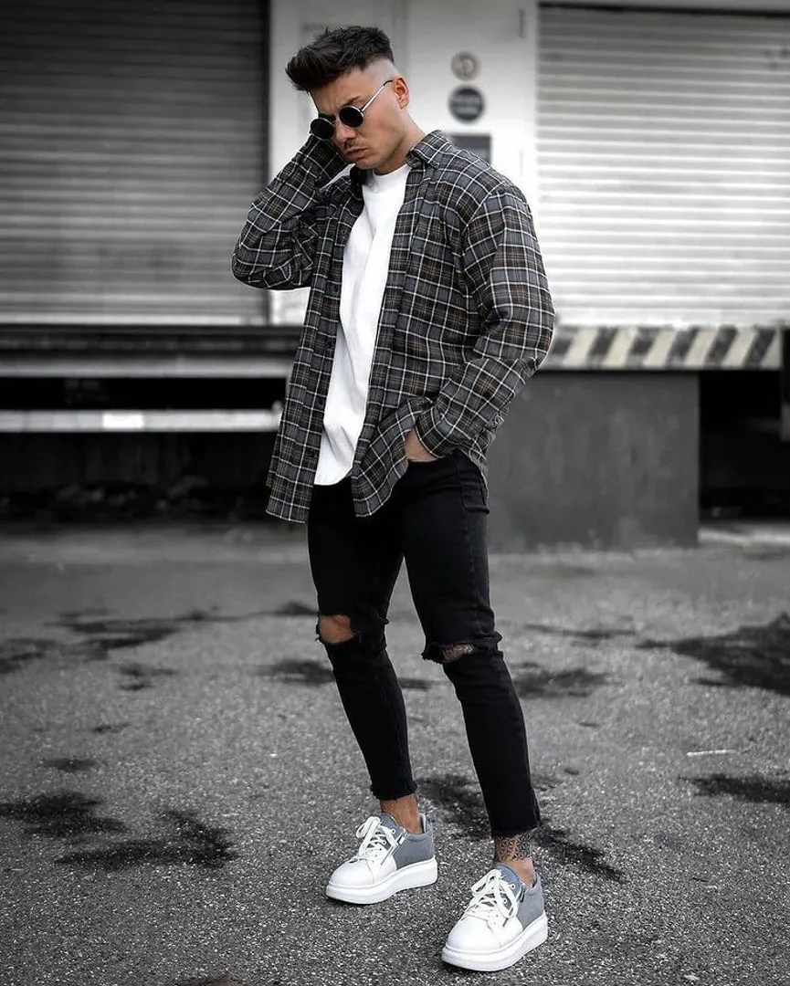 Возьмите черные или серые джинсы за основу для ваших клетчатых рубашек. Серые прямые джинсы с белой футболкой с V-образным вырезом, прекрасно комбинируются с синей рубашкой в клетку.