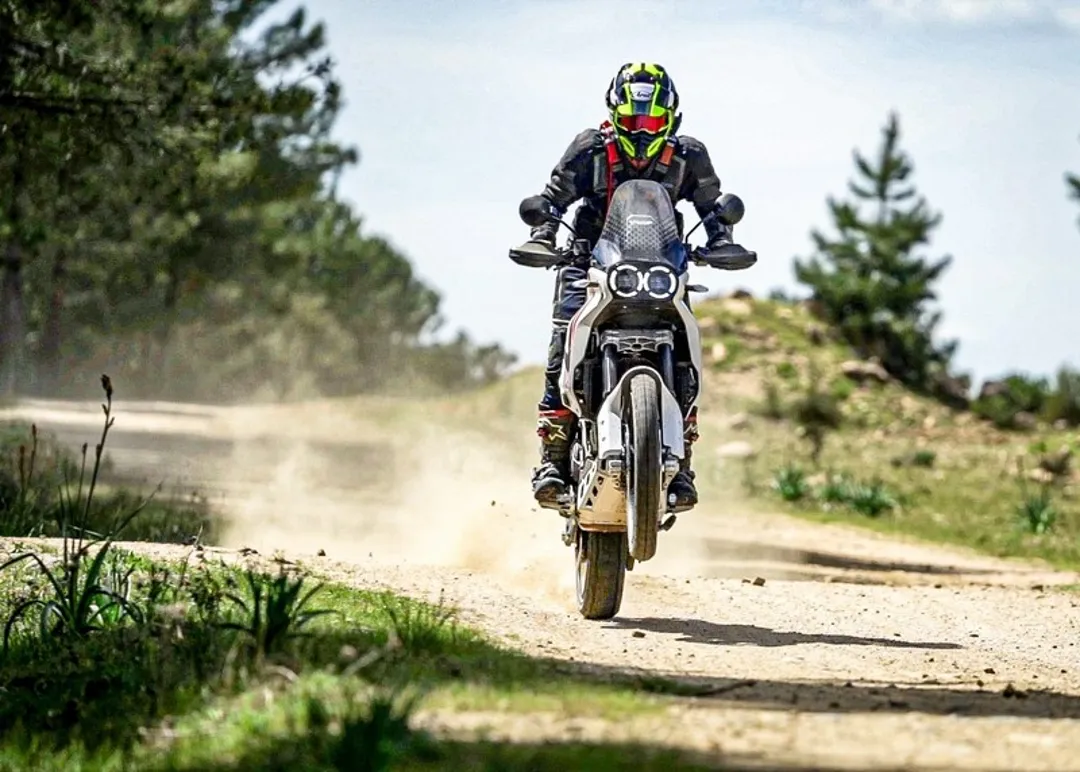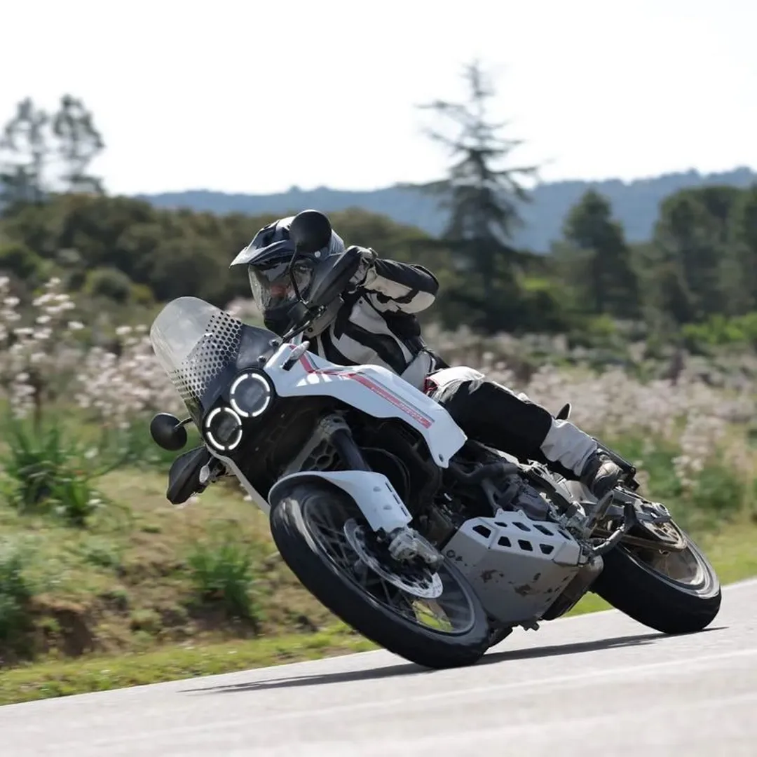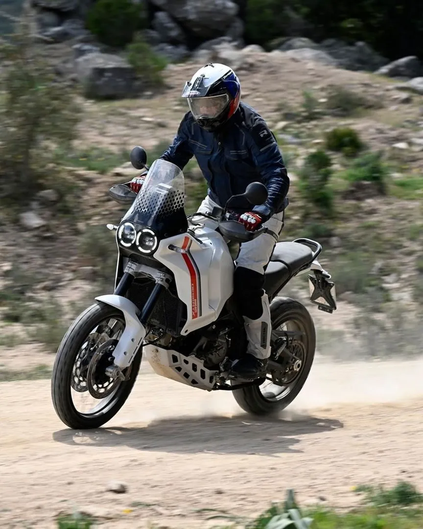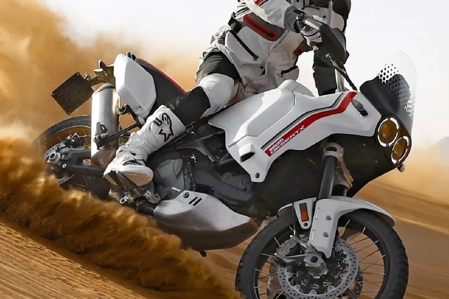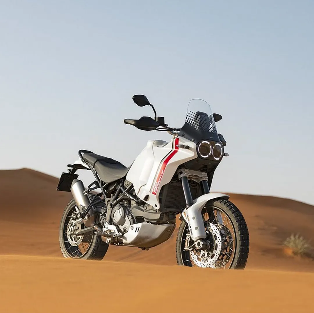 Модель DesertX, является настоящим эндуро-байком. Его дизайн напоминает макси-эндуро восьмидесятых годов, а в стальную решетчатую раму встроен двухцилиндровый Testastretta 11° с жидкостным охлаждением и десмодромным распределением; при объеме 937 куб. см он развивает 110 л.с. при 9 250 об/мин и 92 Нм при 6 500 об/мин. Очень интересные цифры, особенно если соотнести их с сухим весом в 202 кг.