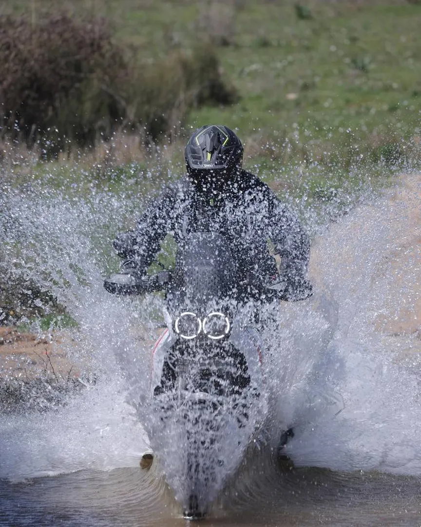Внедорожный настрой подтверждает дорожный просвет в 250 мм, а также размер шин Pirelli Scorpion Rally STR: передние 90/90-21, задние 150/70 R18. Высота седла составляет 875 мм, а триангуляция между седлом-педалями-ручками выверена для езды стоя.