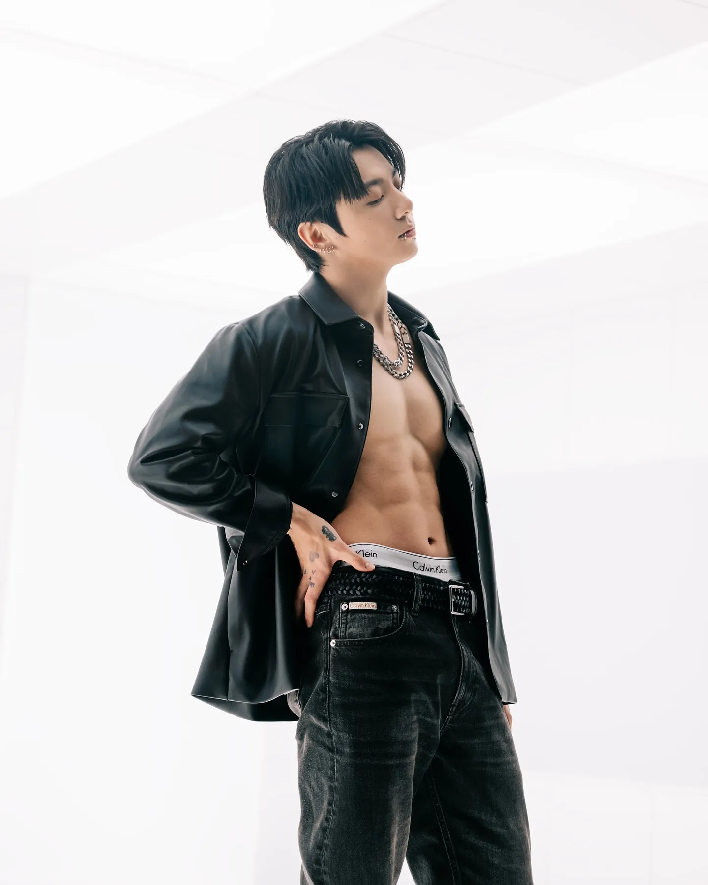 Рассматривая кадры из новой кампании, я ловлю себя на мысли, насколько точно она уловила дух времени — ностальгию по 90-м. Мне нравится, как его образ, выдержанный в его любимом чёрном цвете, сочетает в себе бунтарскую эстетику кожаной куртки с мехом и утончённость серебряных украшений. Это не просто реклама одежды — это создание целой истории, где он предстаёт романтическим идолом для нового поколения.