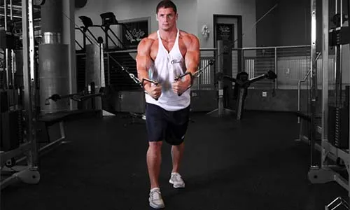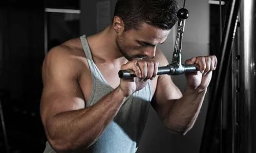6. Разгибание рук на трицепс в верхнем блоке с металлической или канатной рукоятью. 10-12 повторений, 4 подхода.