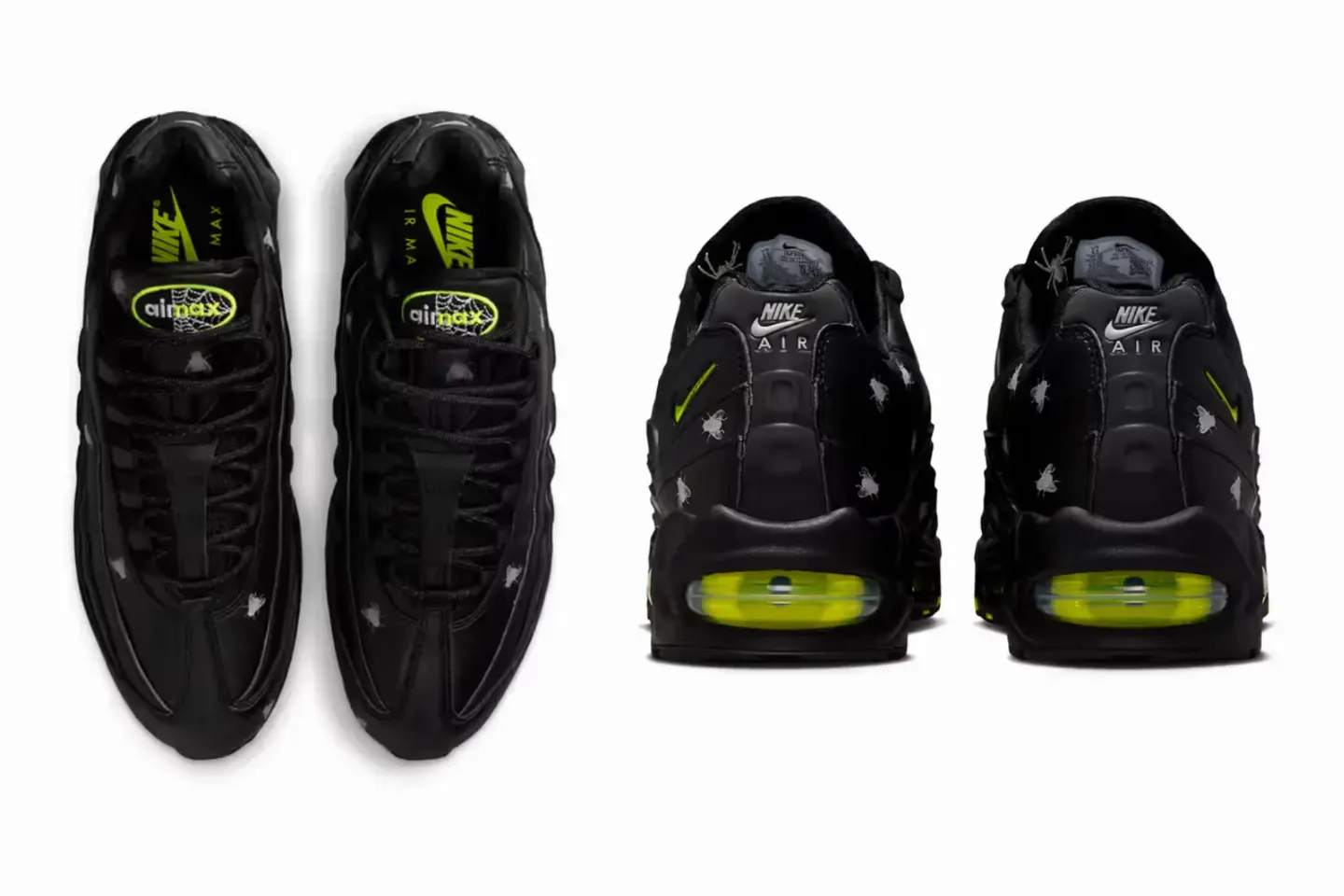 Чёрная кожаная основа верхней части кроссовка служит идеальным фоном для детализированного принта с мелкими мухами. Благодаря использованию материала 3M, они подсвечиваются практически призрачным светом, едва на них попадает луч света. Неоново-желтые акценты напоминают о токсичных жидкостях, а на язычке всё завершает логотип Air Max, оплетённый паутиной, — финальный штрих, усиливающий хэллоуинское настроение.