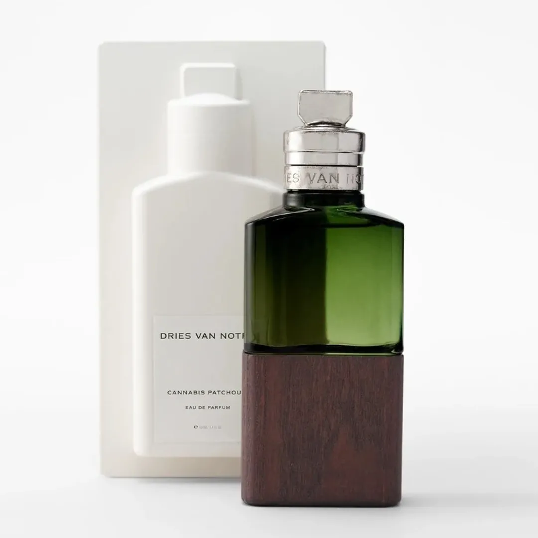 Cannabis Patchouli от Dries Van Noten Beauty, с мускатным шалфеем и пачули. Во флаконе из дерева ручной работы, сертифицированного PEFC®, и зелёного стекла.