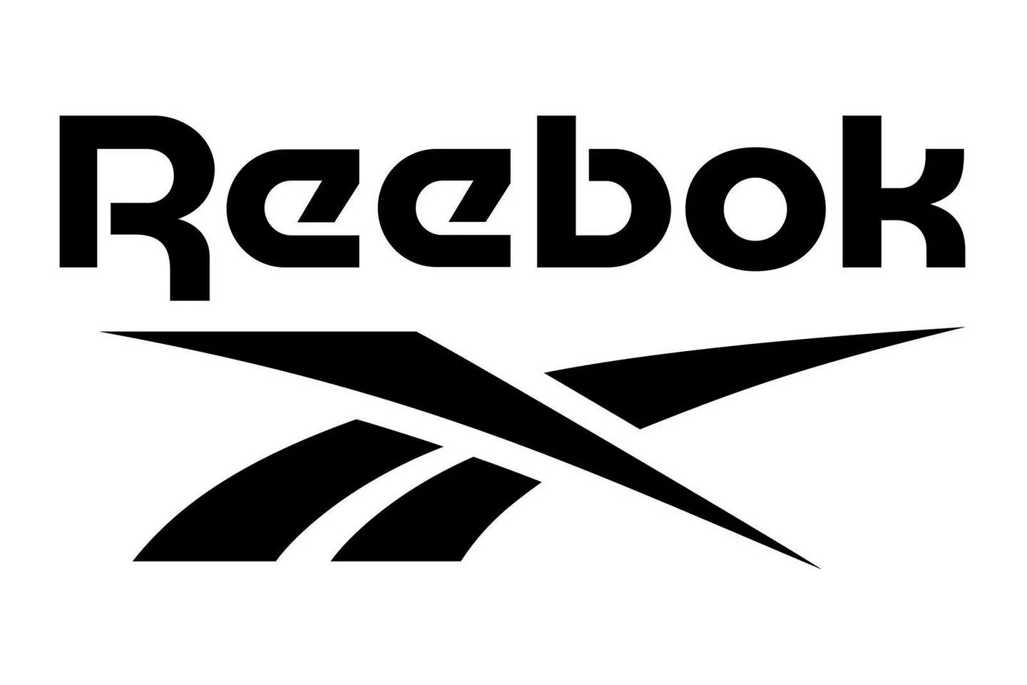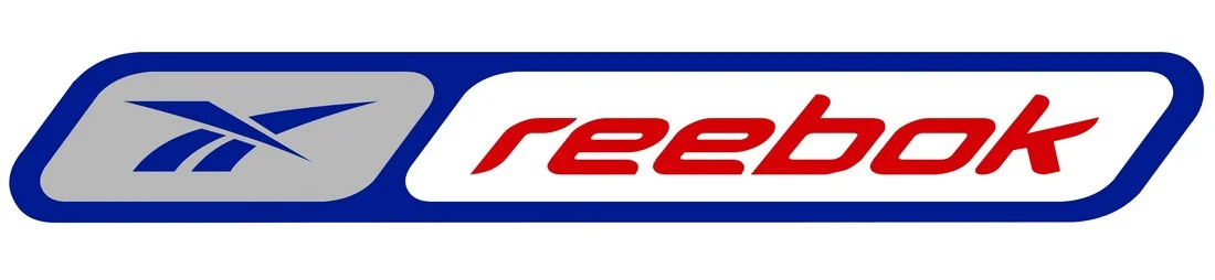 Прямоугольная эмблема разделена на две части. Слева - три синие линии, справа - курсивная надпись «reebok», выполненная строчными буквами.