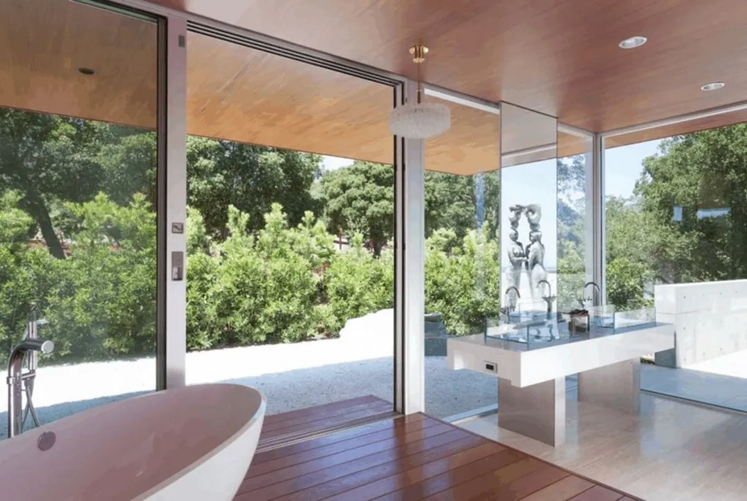 Поразительной особенностью трехэтажного особняка представляют высокие стеклянные стены, благодаря которым открываются захватывающие виды на залив Сан-Франциско и окрестности. Тем, кого волнует уединение, не стоит беспокоиться: горный пейзаж скрывает дом от случайных прохожих.