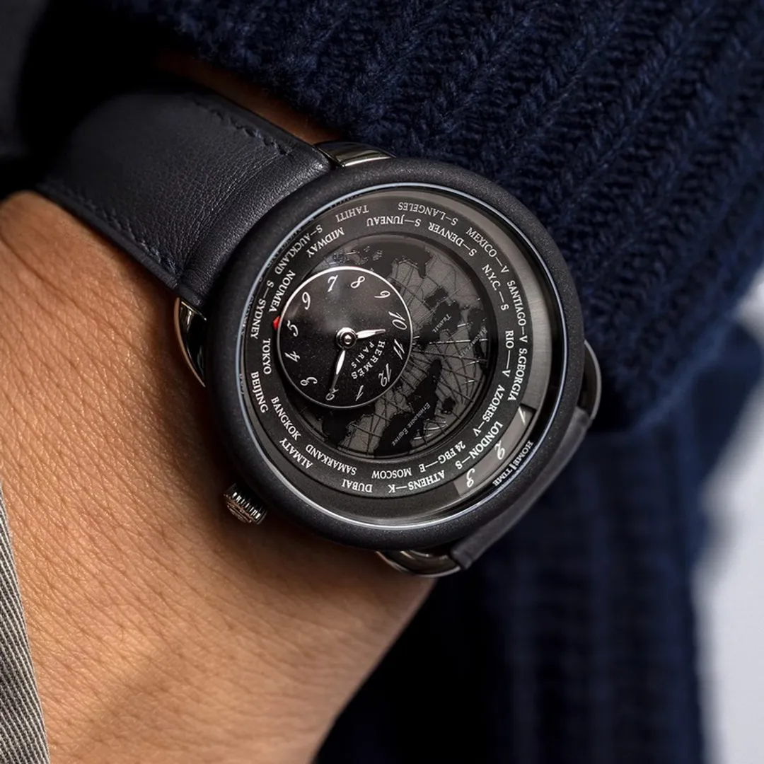 С игривым духом, характеризующий нестандартный подход, типичный для часов Hermès, модель представляет новую интерпретацию часов Мира. Механизм «temps voyageur», разработанный специально для французского дома, отображает 24 часовых пояса на круглом диске: спутник, на фоне фантастической карты, разработанной Жеромом Кольяром. Часы, минуты и второй часовой пояс с индикацией городов приводятся в движение механизмом с автоподзаводом. Платиновый корпус обладает диаметром 41 мм и титановым безелем.