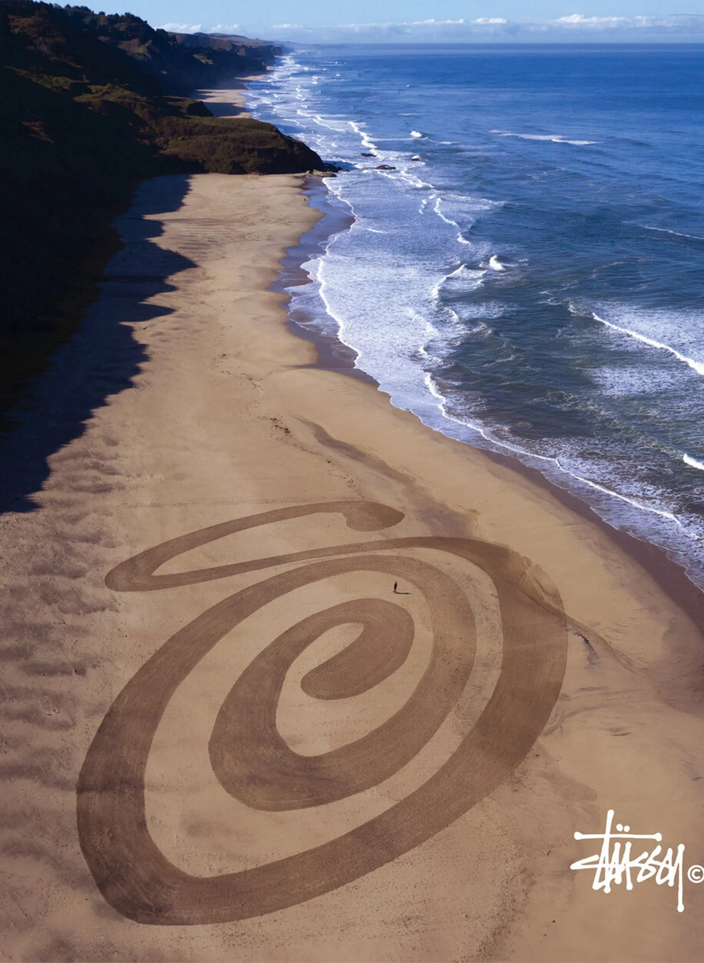 Когда Stüssy выпустил свою коллекцию Summer 2020, в маркетинге коллекции были использованы работы современного художника-земляка @jimdenevan. Деневан известен во всем мире тем, что наносит сложные геометрические рисунки на песок с помощью граблей и палок, на создание которых уходит несколько часов и которые легко смывались морем. Как коренной калифорниец и серфингист, он идеально вписался в эту коллаборацию, учитывая, что бренд родился в 80-е годы в Калифорнии. Деневан изобразил знакомую фигурную букву «S» на пляжном песке, расположенном в Северной Калифорнии, и разместил ее в интернете, печатной рекламе и на специальной графической футболке.
