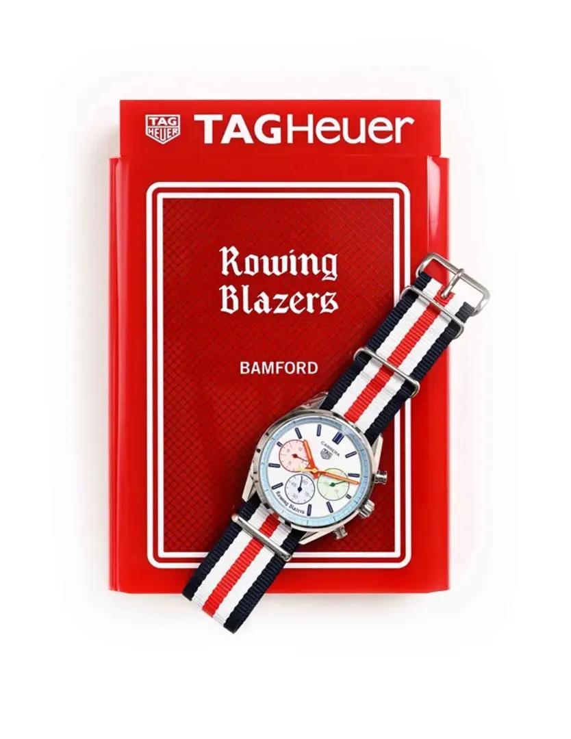 Пара прибегла к помощи известного часовщика Джорджа Бэмфорда для разработки дизайна часов и поручила Tag Heuer их изготовление. Результат получился забавным, почти непочтительным и очень напоминающим хронометр Yacht-Timer. Часы имеют чистый белый циферблат, внешнюю дорожку 1/5 секунды синего цвета, красно-оранжевую и желтую стрелки со специальным трехрегистровым дисплеем хронографа. Если присмотреться, то можно заметить, что красный, синий и зеленый тотализаторы очерчены узором, напоминающим «точки Бен-Дея», используемые в комиксах Роя Лихтенштейна и картинах в стиле поп-арт. Часы также снабжены тройной подписью Tag Heuer, Bamford и Rowing Blazers, напоминающей классические циферблаты с двойной подписью на часах Cartier, Tiffany & Co. и других.