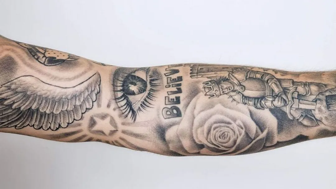 На той же руке есть еще несколько татуировок. Среди них голова тигра, голова рыцаря и замок — все они появились примерно в одно время, в 2018 году.