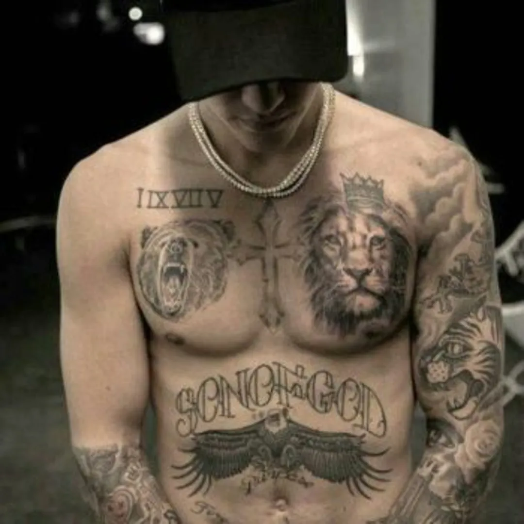 Как уже упоминалось, татуировок с религиозным подтекстом на теле звезды несколько — до этого мы упомянули три таких тату. Есть еще изображение прямо посередине груди, католического большого креста, который появился в 2018 году.