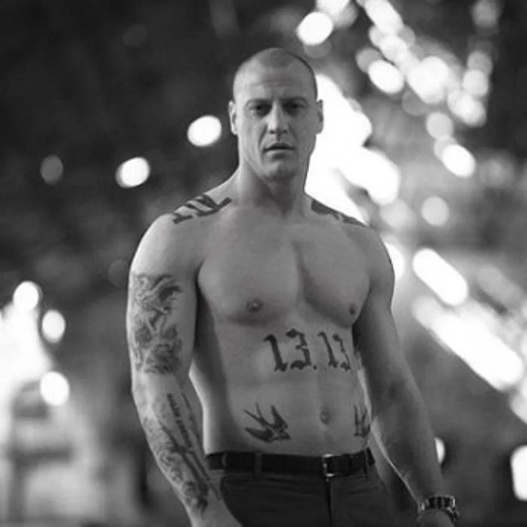 Этот серьезный крупный зверь изображен в черно-белом цвете на левой руке под надписью «Русь». Он стоит на задних лапах и демонстрирует свой оскал. Сама по себе татуировка медведя означает уже сформировавшиеся взгляды, стабильность и устойчивость. Чаще всего это животное изображают на себе упрямые люди, которые имеют свою философию.