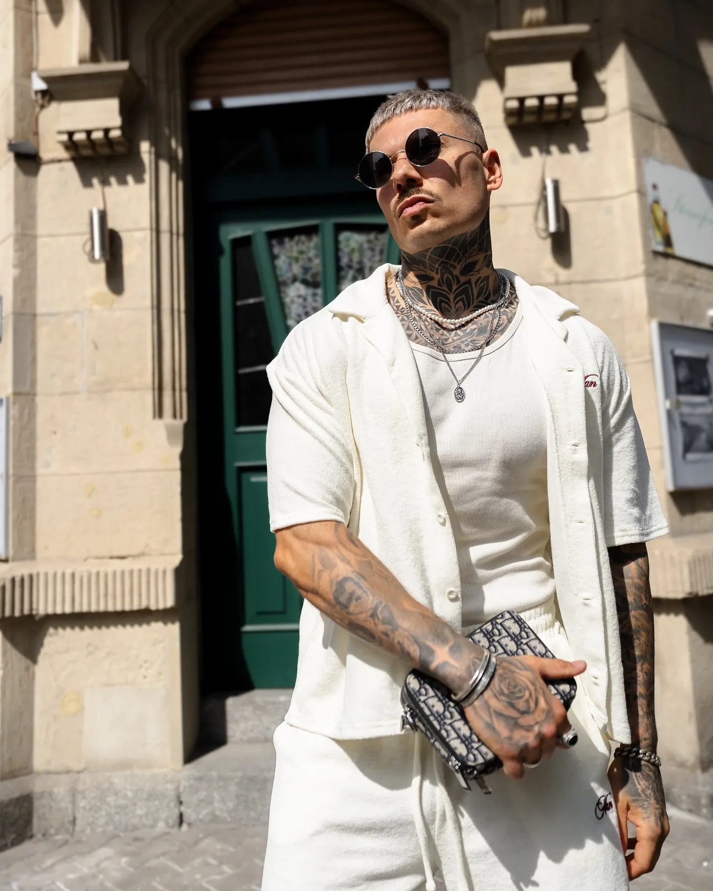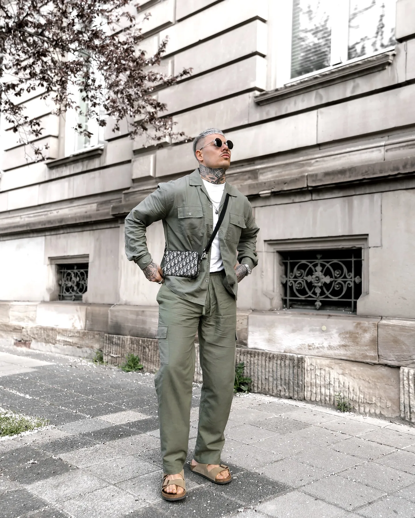- Фишка: Хаки и олива отлично сочетаются с денимом и коричневой кожей (ботинки, ремень), создавая мужественный и непринужденный образ.