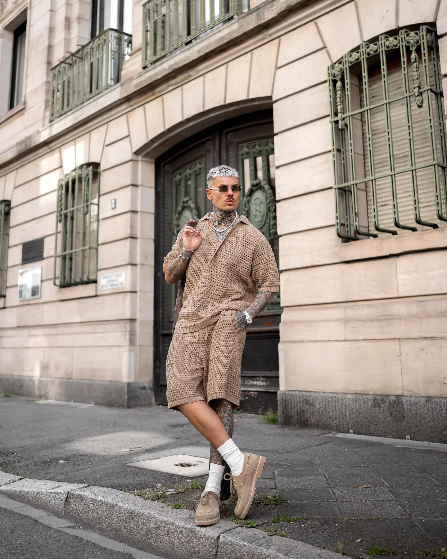 - Где использовать: Создает образ доступного и уверенного в себе мужчины. Коричневые ботинки, ремень и кожаная куртка — основа стиля smart casual. Светлый беж (свитер, брюки-чиносы) визуально «разгружает» образ.