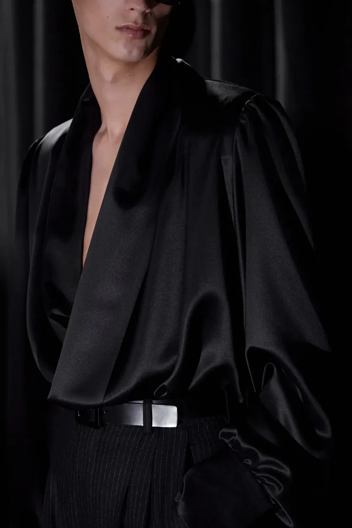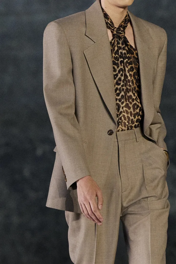 Без пиджаков примерно половина моделей вообще не прикрывала плечи. Похоже, Ваккарелло решил открыть золотой век блузок в мужской моде: одни шелка мягко драпируются по телу, другие окутывают торс чувственной прозрачной тканью, третьи спускаются с шеи в замысловатых, завораживающих формах. «Мне нравится сочетание очень элегантных жакетов и более нежных силуэтов», — отметил Ваккарелло. Уайт согласился и не постеснялся сказать, что модели «все были очень крутыми и красивыми».