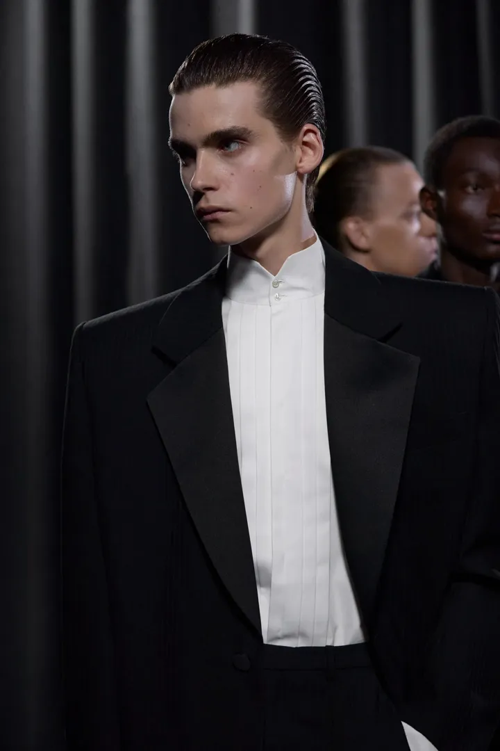 Изысканный баланс, который Ваккарелло установил между острым и резким, мягким и чувственным, позволил любопытной молодой звезде стиля многому научиться. За кулисами Ваккарелло подтвердил, что с показа можно увезти домой «послание», и выразил надежду, что гости уйдут с определенным силуэтом в голове. Другими словами: серия безразмерных жакетов, позаимствованных с его последнего показа женской одежды, с плечами, напоминающими консоль, спроектированную Мисом: простые и мощные линии, подчеркнутые узкими брюками с высокой талией и головокружительными ботинками под ними.