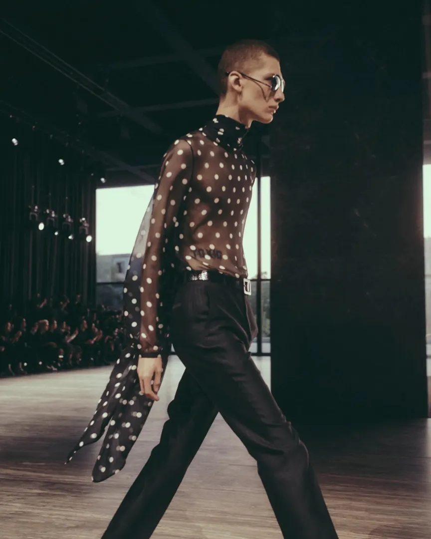 Это культ Сен-Лорана: круг людей, одевающихся оригинальным образом, который может быть самым эксклюзивным в моде. «Все они принадлежат к своего рода семье», — сказал актер и скейтер Эван Мок, завсегдатай YSL на своем четвертом показе мод, перед тем как занять свое место на табурете в Барселоне. Рядом испанский актер Ману Риос, одетый в кожаный пыльник длиной до пола, общался с певцом-песенником Конаном Греем, а Бетти Катру, муза Yves Saint Laurent, болтала с Аней Рубик, польской супермоделью, вдохновившей Ваккарелло.