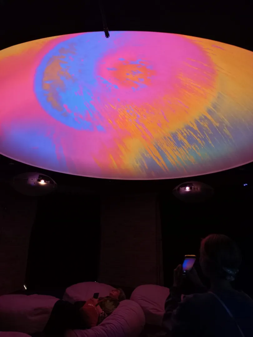 Круглый зал с мешками-лежанками в центре, для уникальной медитации под огромным куполом свисающем с потолка, имитирующим небесное светило – солнце. Зрелищная инсталляция, позволяет посетителям удобно расположиться на мешках и созерцать процессы, проходящие на солнце и дающие в конечном итоге нам жизнь. Поэтому неудивительно, почему солнце – один из главных элементов в цепочке эволюции человека.