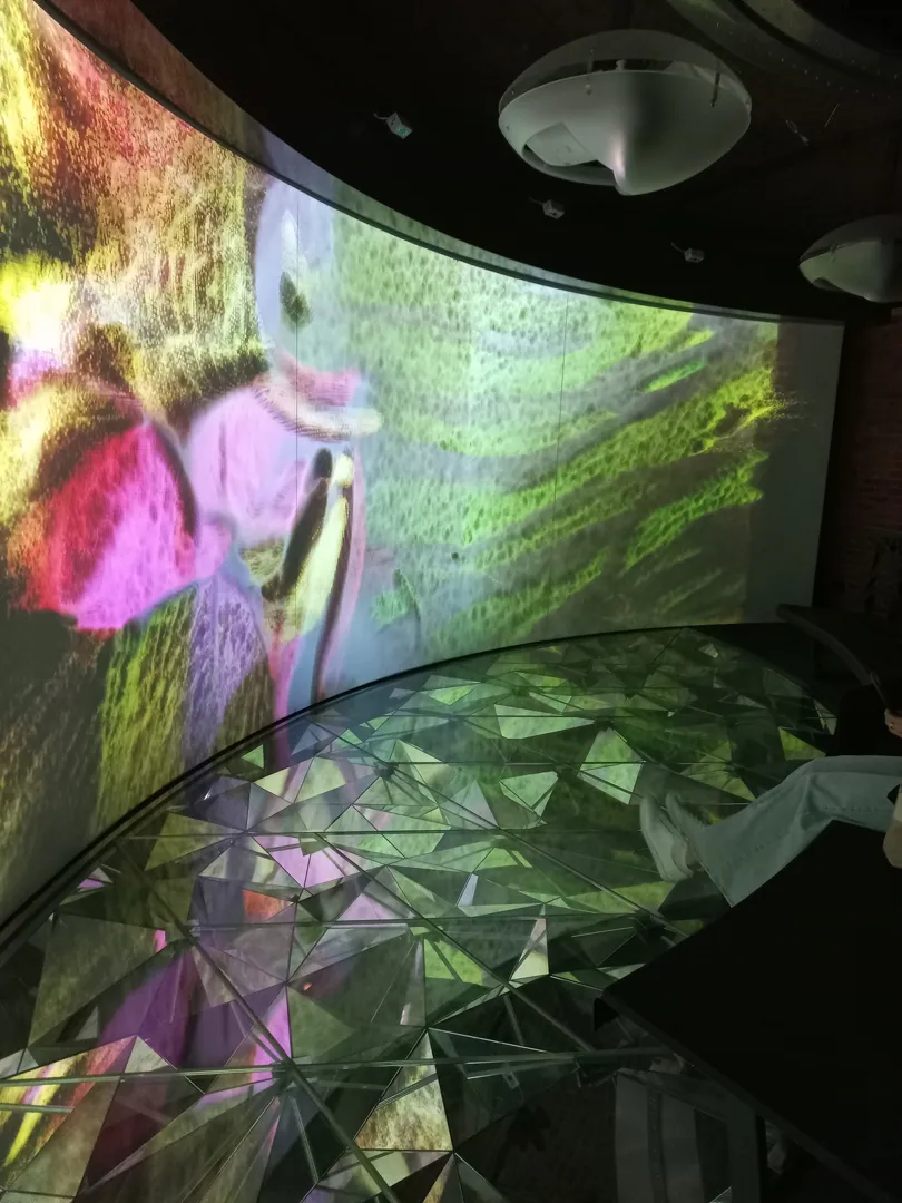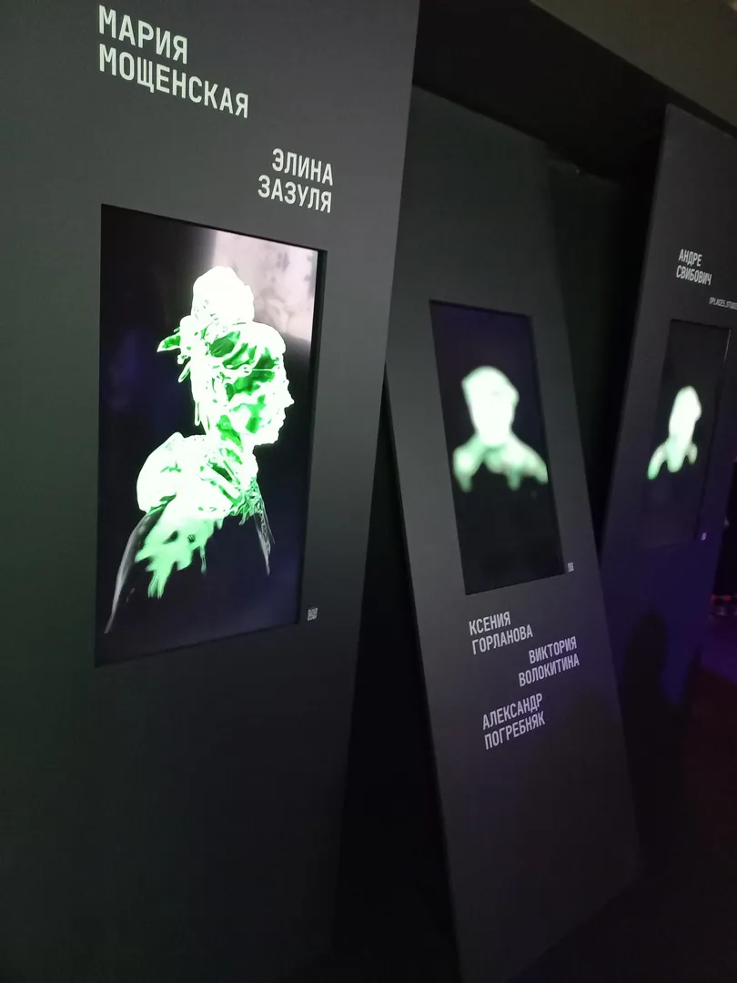 В полумраке, на входе в зал первой инсталляции на левой стене расположились цифровые портреты создателей. Художников чьи идеи воплотились в грандиозные работы, исследующие жизнь на Земле и заставляющие задуматься над местом человека в цепочке зарождения процессов существования.