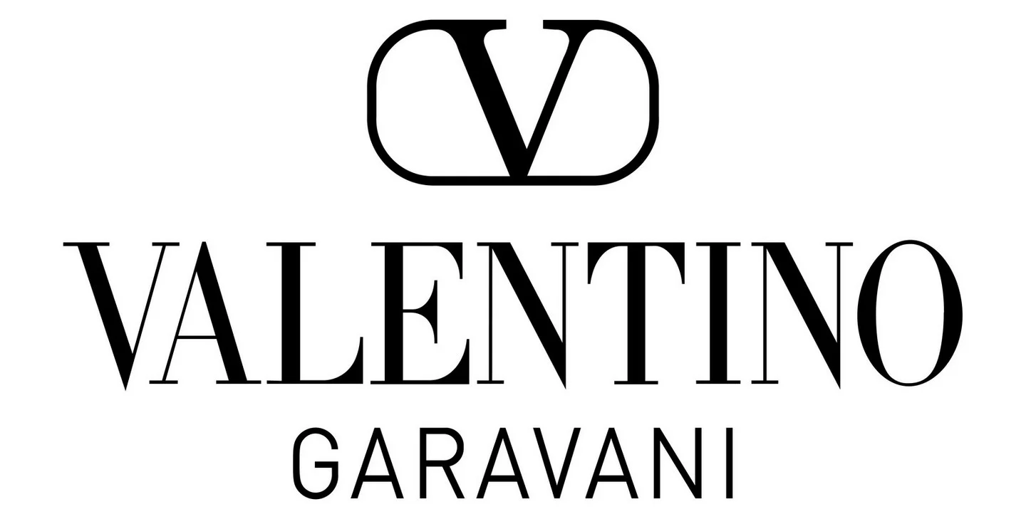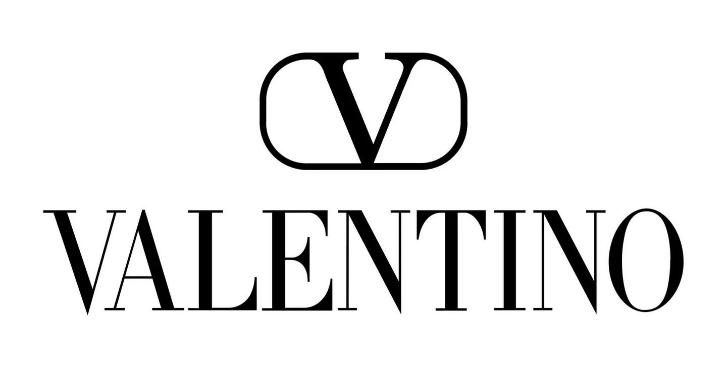 Торговое название разделено на два уровня, так как включает в себя и имя, и фамилию итальянского дизайнера. Первая строка - самая большая: слово «Valentino» набрано жирным шрифтом в верхнем регистре. Буквы состоят из линий разной толщины, что придает им элегантность. Некоторые из них имеют тонкие засечки, а другие заканчиваются острыми, похожими на иглы кончиками. Надпись во втором ряду не так бросается в глаза: она выполнена тонким шрифтом sans-serif и выровнена по центру. Над ними красуется знаковый знак «V» с удлиненными засечками, образующими почти полный овал. Схематично он напоминает императорскую корону, ведь основателя модного бренда часто называют императором моды.